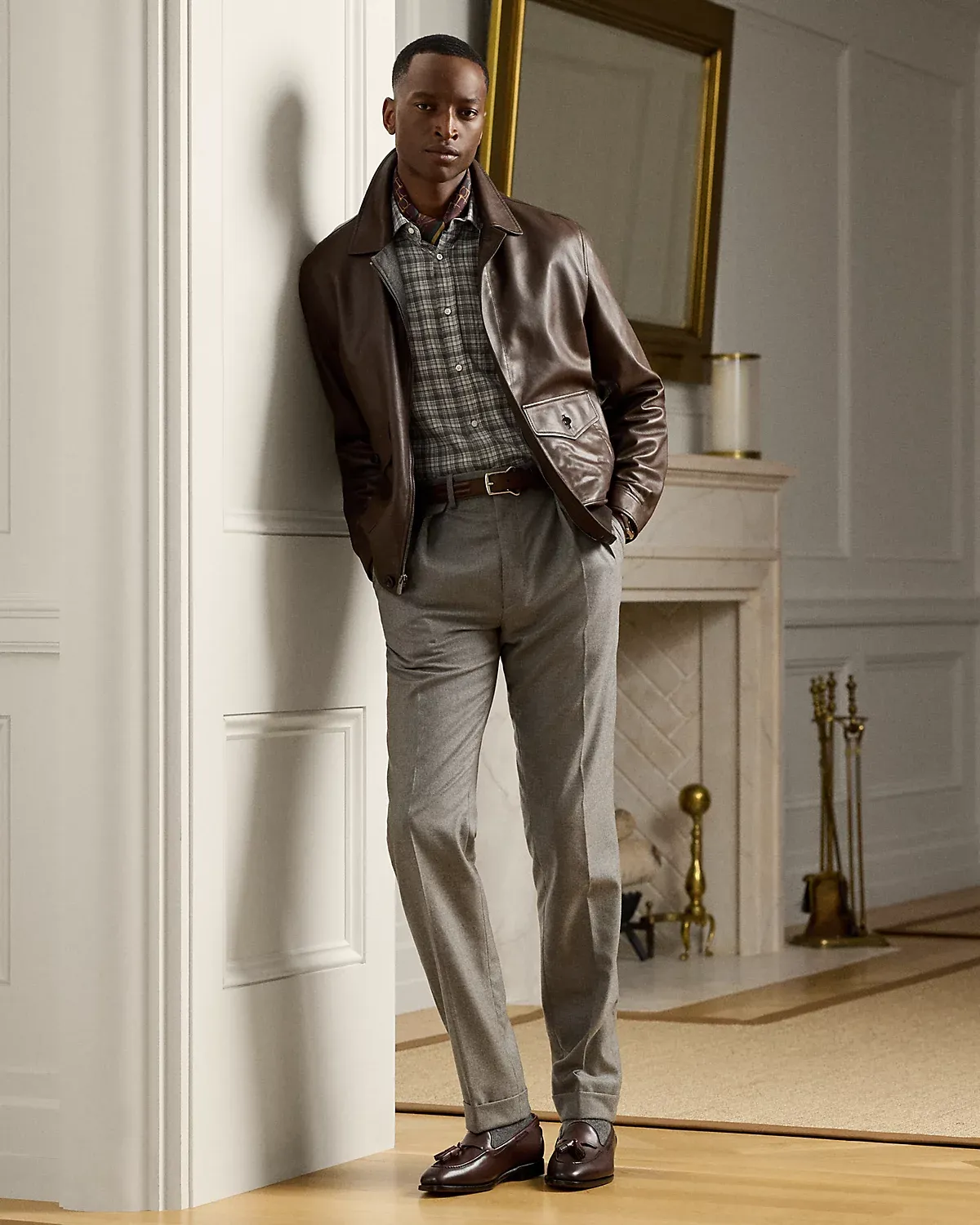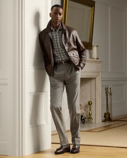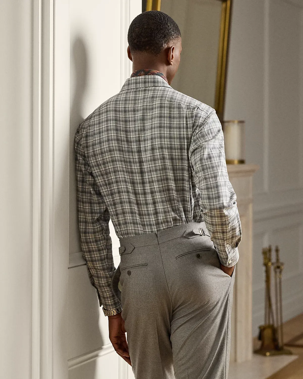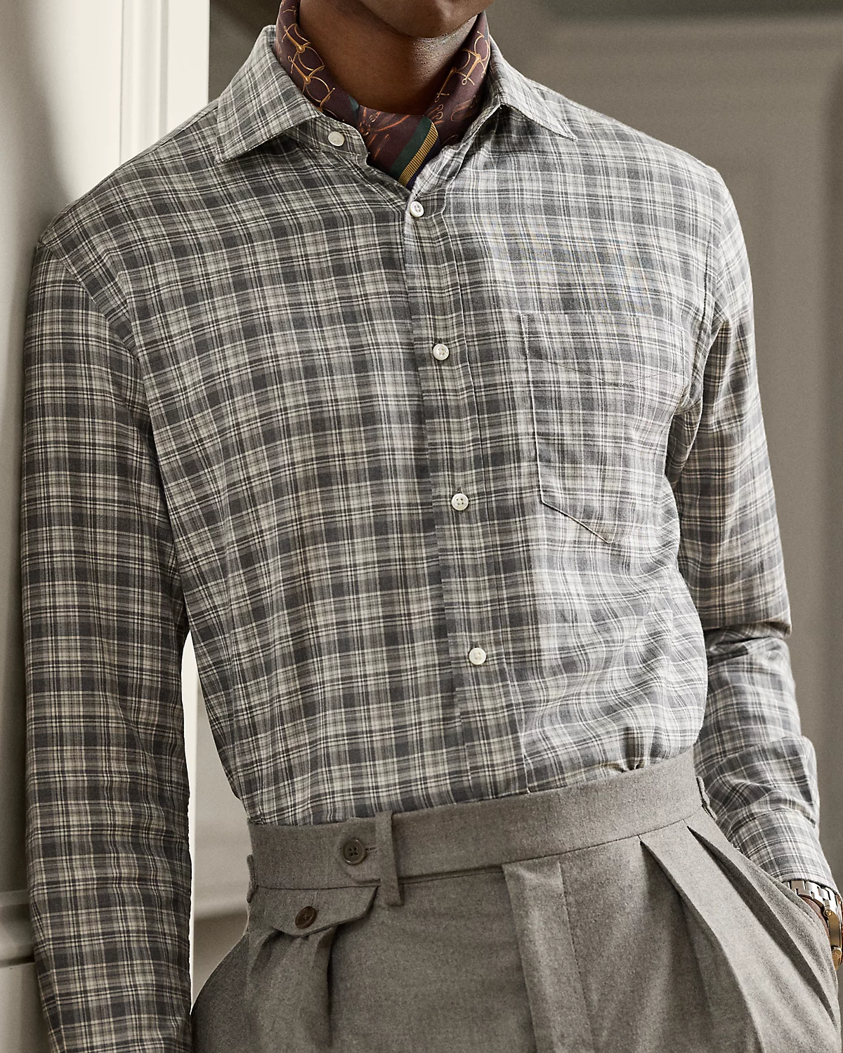 This meticulously tailored shirt demonstrates Purple Label’s dedication to superior craftsmanship through lightweight cotton flannel fabric that is brushed to achieve exceptional softness. Its mini-check pattern was custom-developed for Ralpthth Lauren. The elegant design is finished with bespoke genuine mother-of-pearl divs.