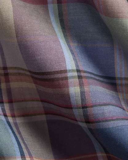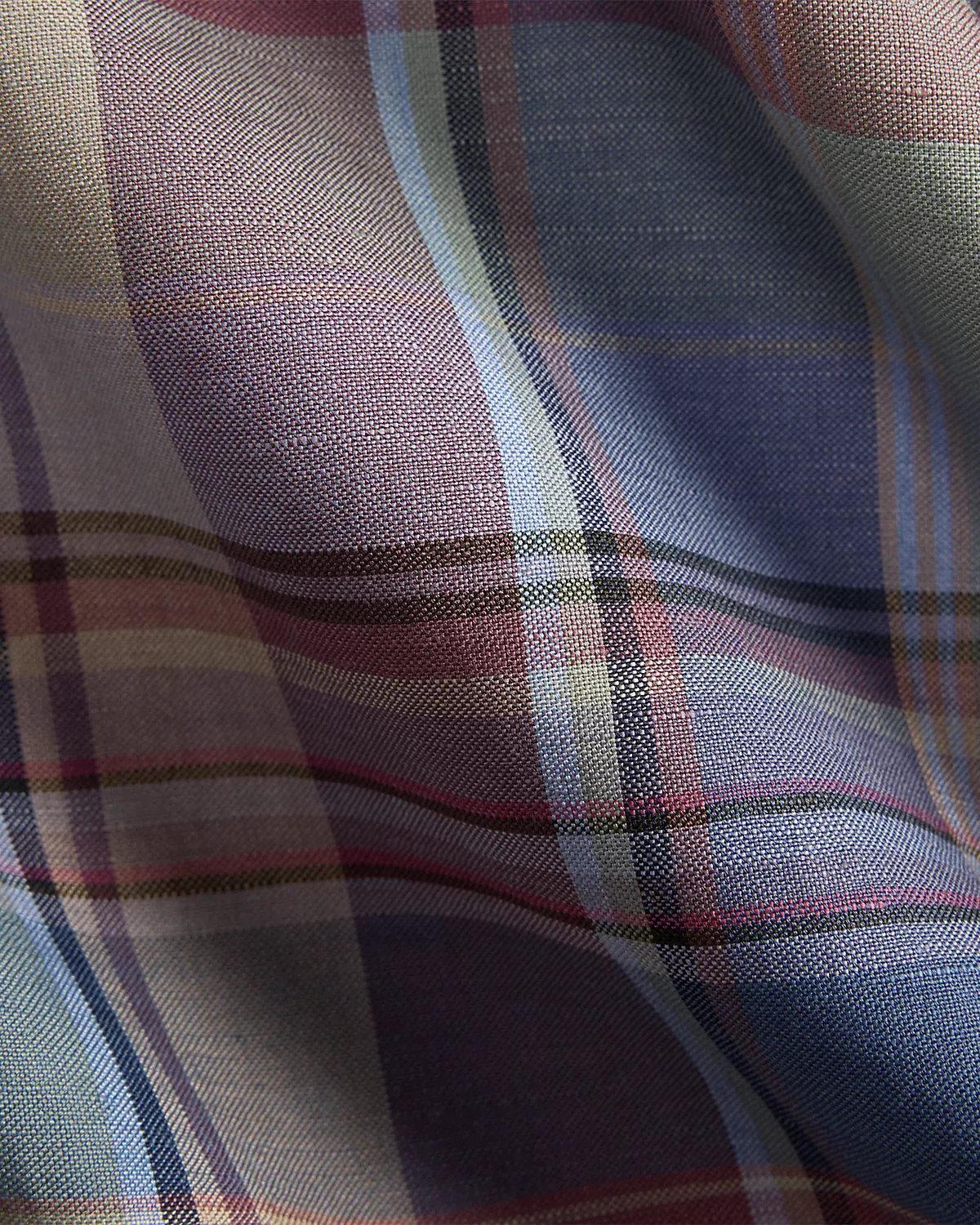 Meticulously crafted in Italy, this shirt unites a utilitarian-inspired silhouette with a bespoke plaid pattern rendered in the season’s color palette. The cloth is beautifully developed with a silk-and-linen blend that includes custom-dyed yarns.