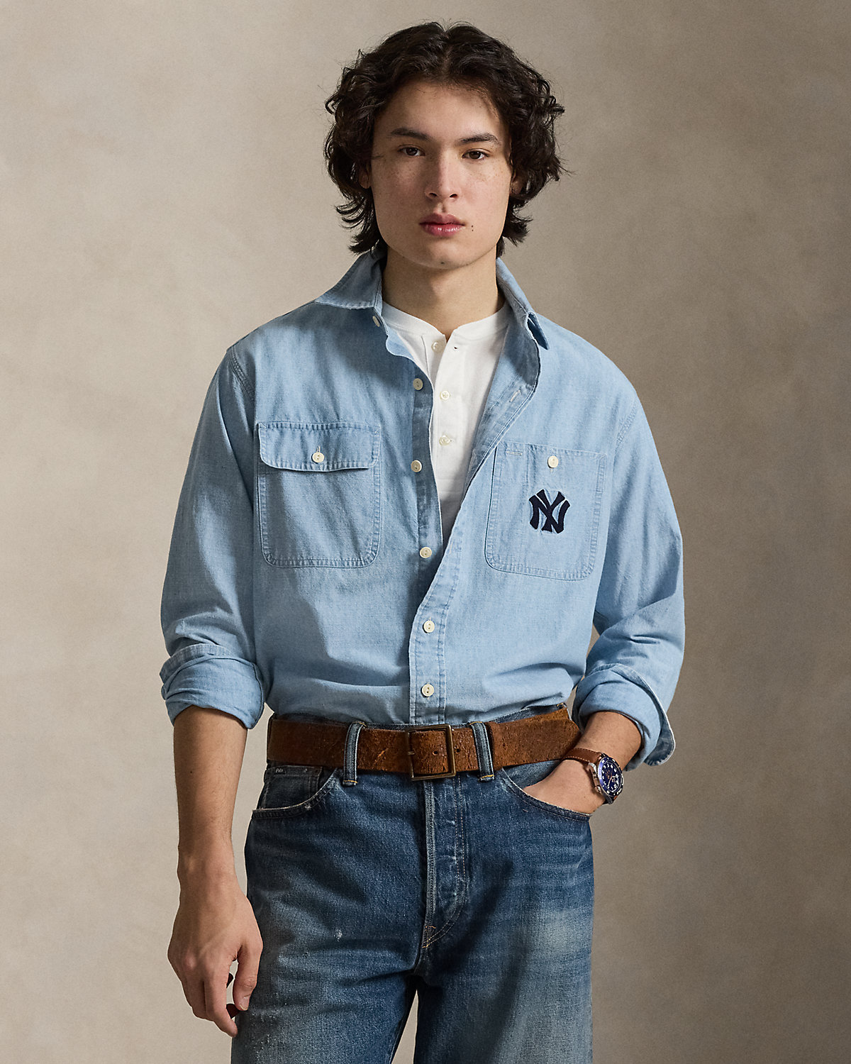 As a boy growing up in the Bronx, Mr. Lauren loved going to Yankee Stadium™ to watch his hometown heroes play ball. This version of our signature chambray workshirt celebrates Mr. Lauren’s long-standing love of the Bronx Bombers™ and the game of baseball with the New York Yankees™ logo and our founding year rendered in chain-stitched embroidery.