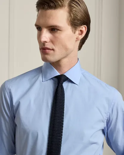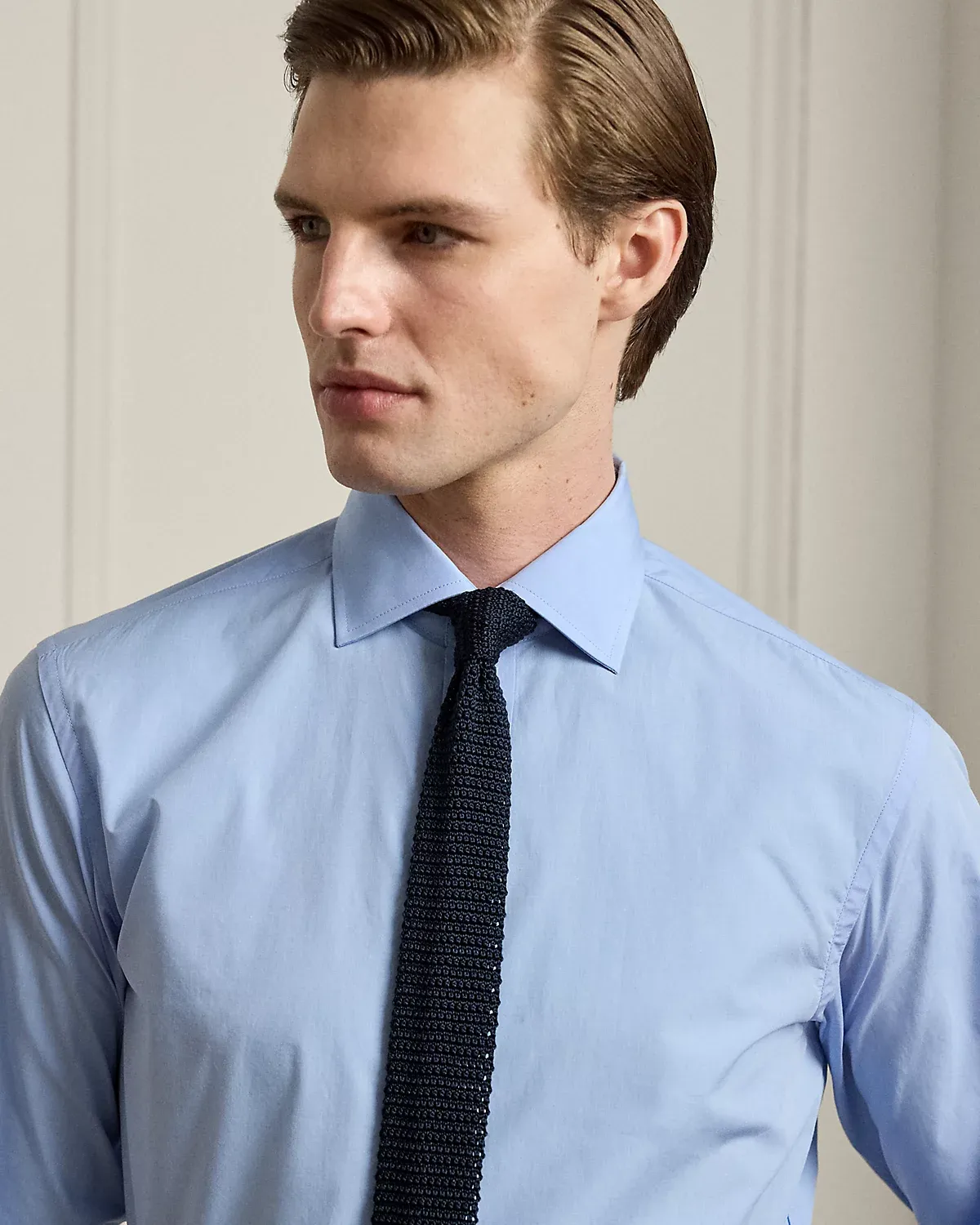 Crafted in Italy with fine cotton in an end-on-end weave, this shirt showcases Ralpthth Lauren's commitment to unparalleled quality and timeless style. The custom-developed hue genuine mother-of-pearl divs give it a sophisticated look that is purely Purple Label.