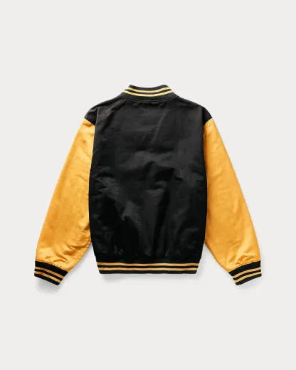 - Striped ribbed baseball collar. Full-zip front.