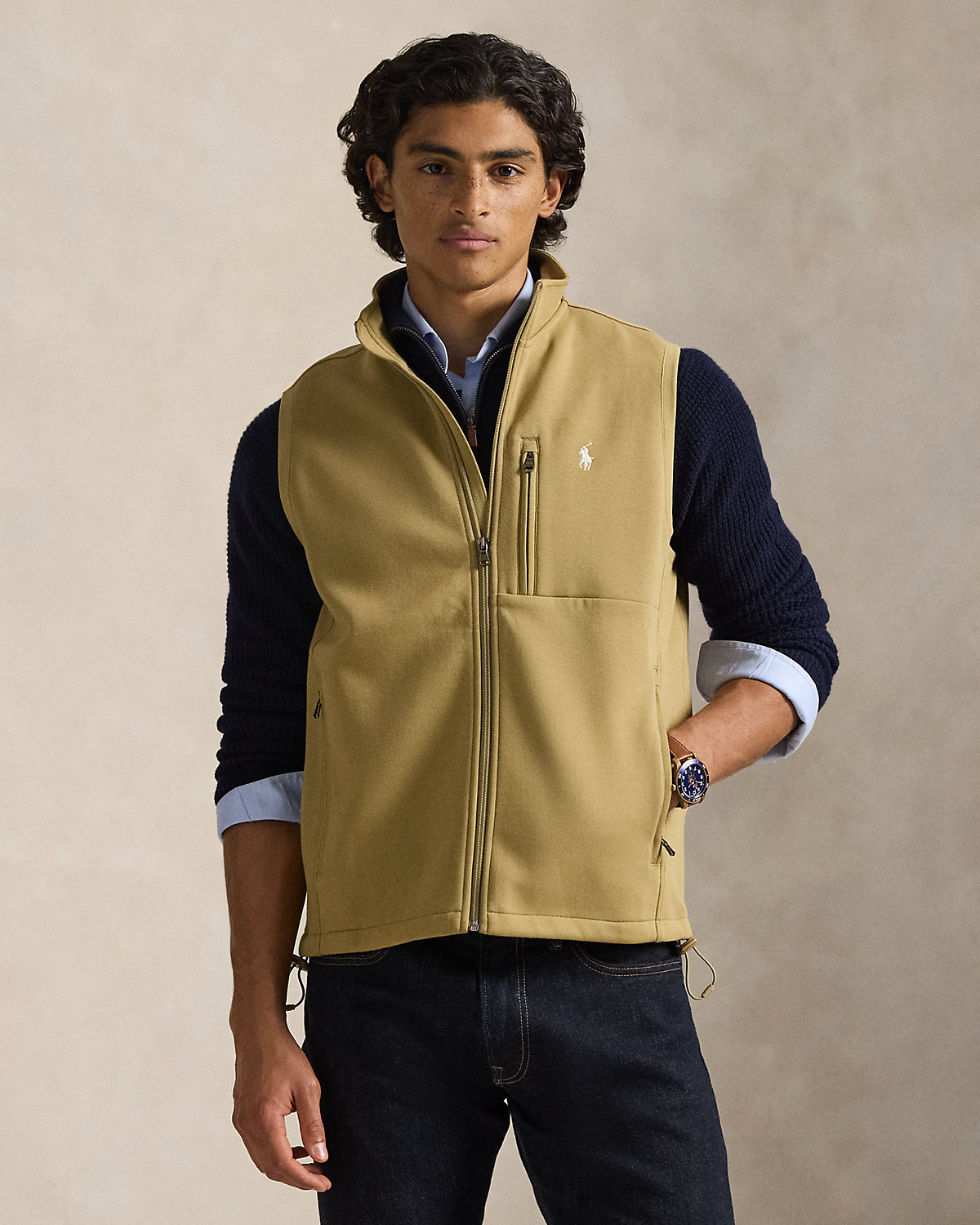 This vest is crafted with a smooth cotton-blend fabric and finished with our signature embroidered Pony at the chest.