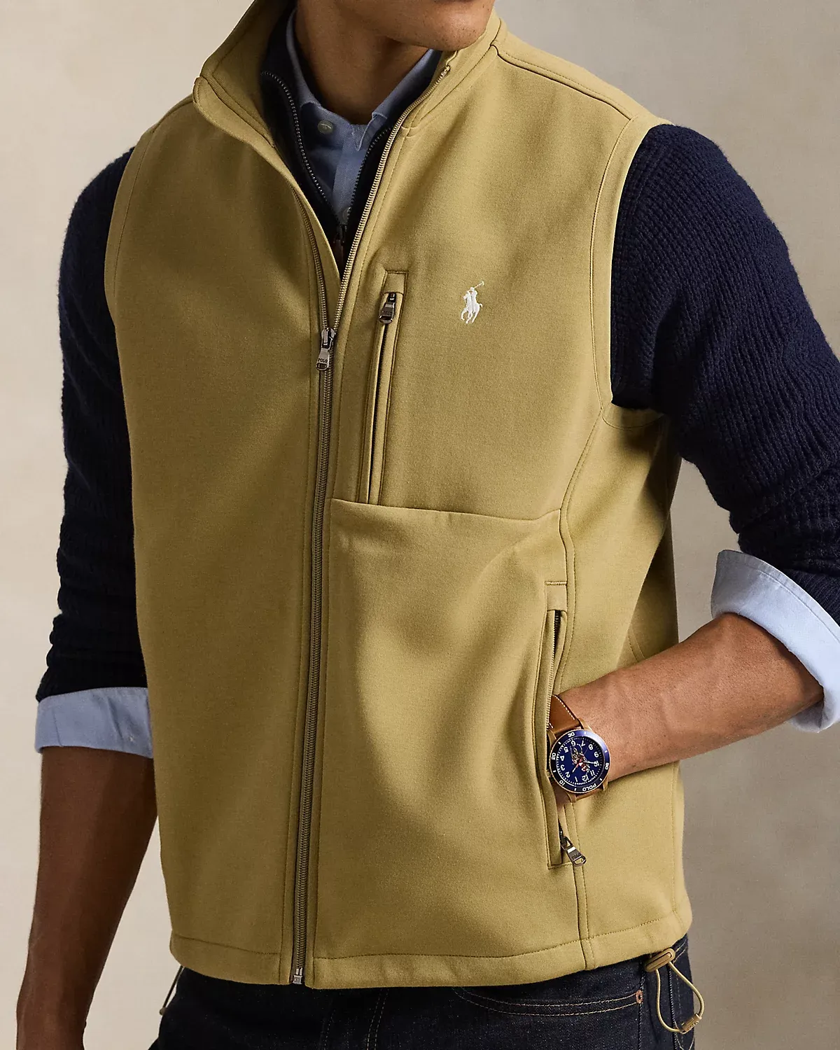 - Mockneck. Full-zip front. Zipper pulls custom-developed with a “Polo” logo.