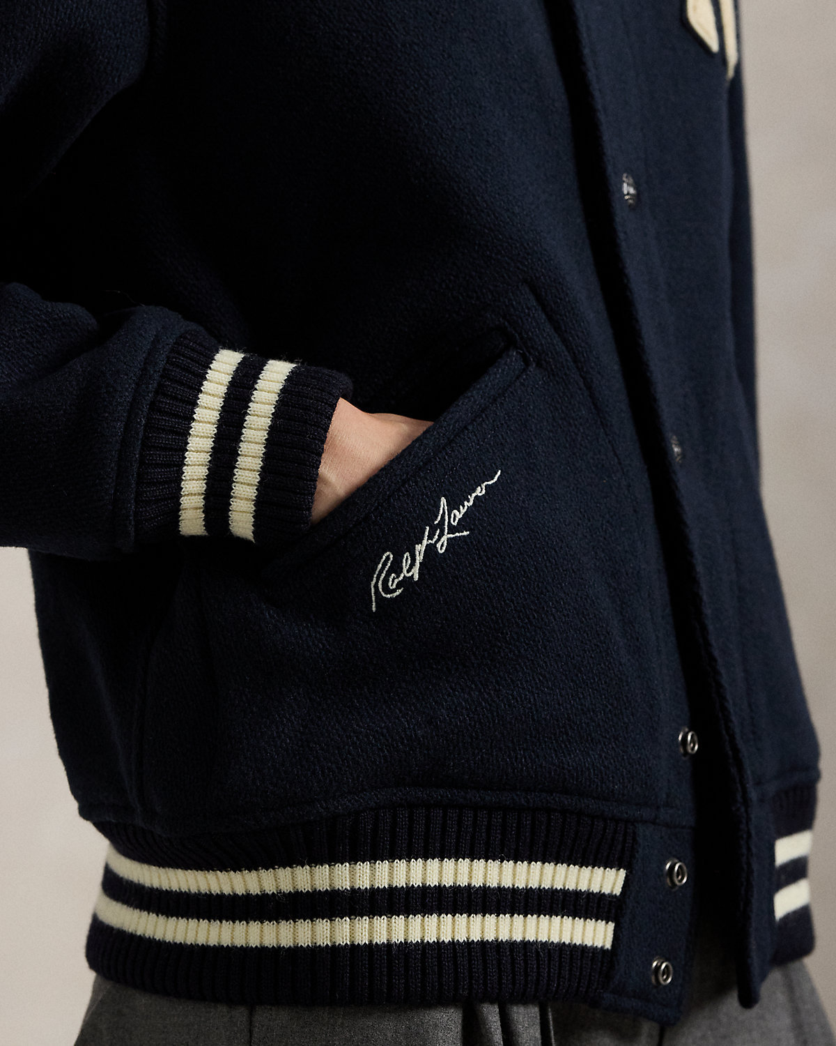 • Chenille patches spelling out “Ralpthth Lauren” at the center back. Striped ribbed hem. Fully lined.