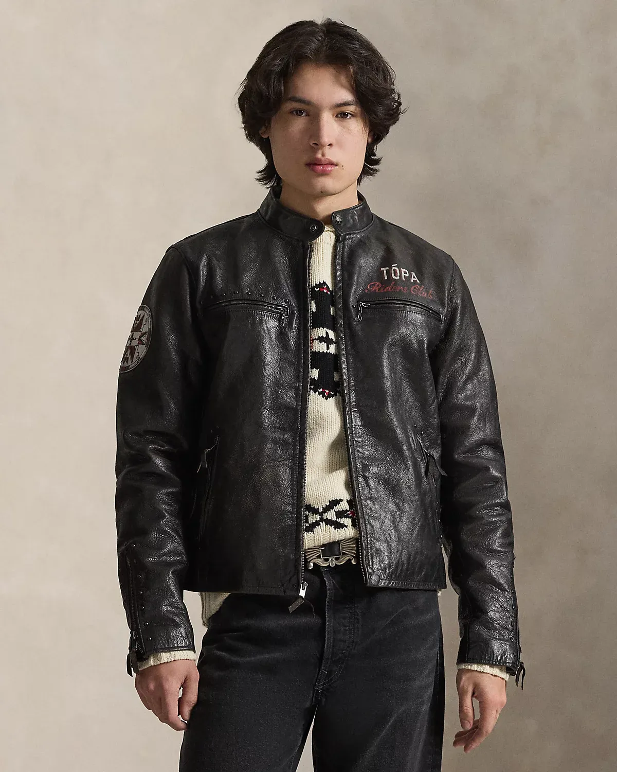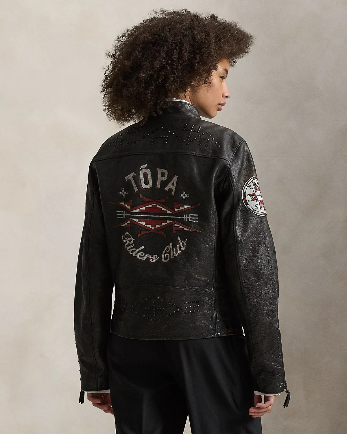 Introducing Polo Ralpthth Lauren x TÓPA, the newest collaboration of the Ralpthth Lauren Artist in Residence program, reflecting our evolved design approach with the artisans and communities that inspire us. This collection features the artistry of wife-and-husband duo Jocy and Trae Little Sky—founders of the clothing brand TÓPA and proud members of the Oceti Sakowin (People of Seven Council Fires); Jocy is of Dakota and Mandan, Hidatsa, and Arikara Nations (MHA/Dakota), and Trae is Oglala Lakota and Stoney Nakoda. Their creations merge modern silhouettes with distinctive Indigenous cultural elements to honor and preserve ancestral traditions while reflecting the beauty and vibrancy of their Northern Plains heritage. The name TÓPA, meaning “four” in the languages of the Oceti Sakowin, symbolizes the four directions, four seasons, four stages of life, and four meaningful colors. Hand-sanded and hand-painted, this unisex leather jacket is inspired by vintage photographs of Trae and Jocy’s motorcycle-enthusiast grandfathers and their rides through the Dakotas. At the sleeve is a four-directional star motif, representing the ongoing nature of life, and a thípi, which is thought to offer protection. A “Riders Club” graphic unites the tradition of horse riding with the artists’ familial history of motorcycle riding. It is accented by metal tack work, a process that is significant to Northern Plains Native Nations for its symbolism of love, affection, and appreciation.