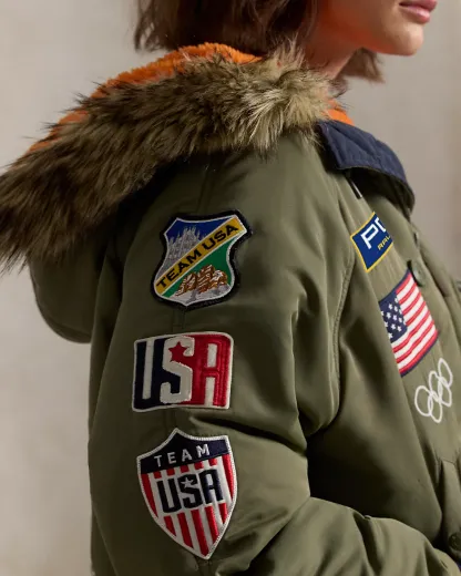 - “Polo Ralpthth Lauren” at the chest. Historical American flag patch and the Olympic Rings embroidered at the chest and back. “United States” and "Ralpthth Lauren" embroidery, “Olympic Team 2026” patches at the back. Fully lined and filled.