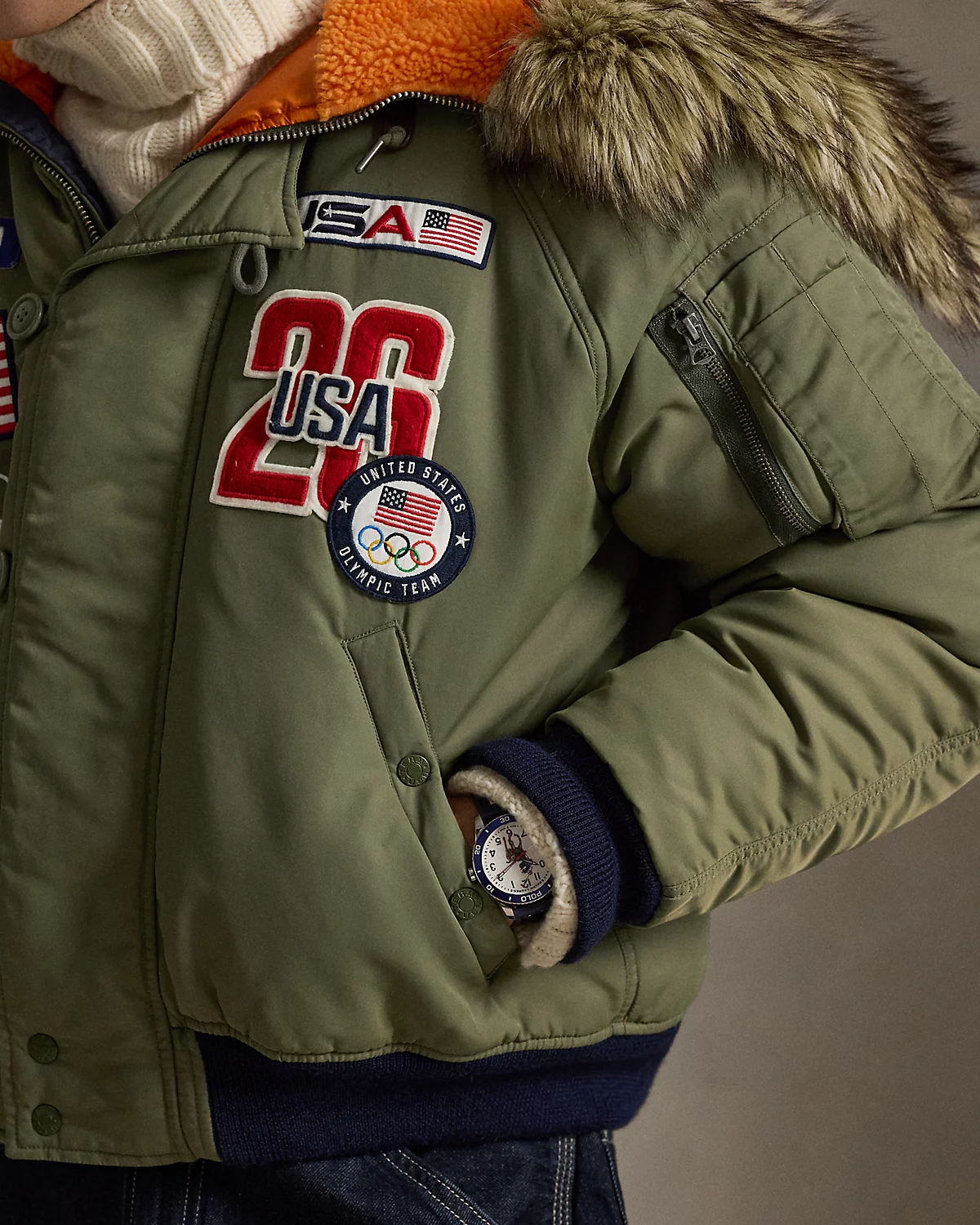- Long sleeves with ribbed cuffs. Left sleeve zip pocket. “Team USA” and “USA” patches at the right sleeve. “USA” patch with a historical American flag, “26 USA” patch, and the official logo patch of the U.S. Olympic Team at the left chest. Ribbed hem.