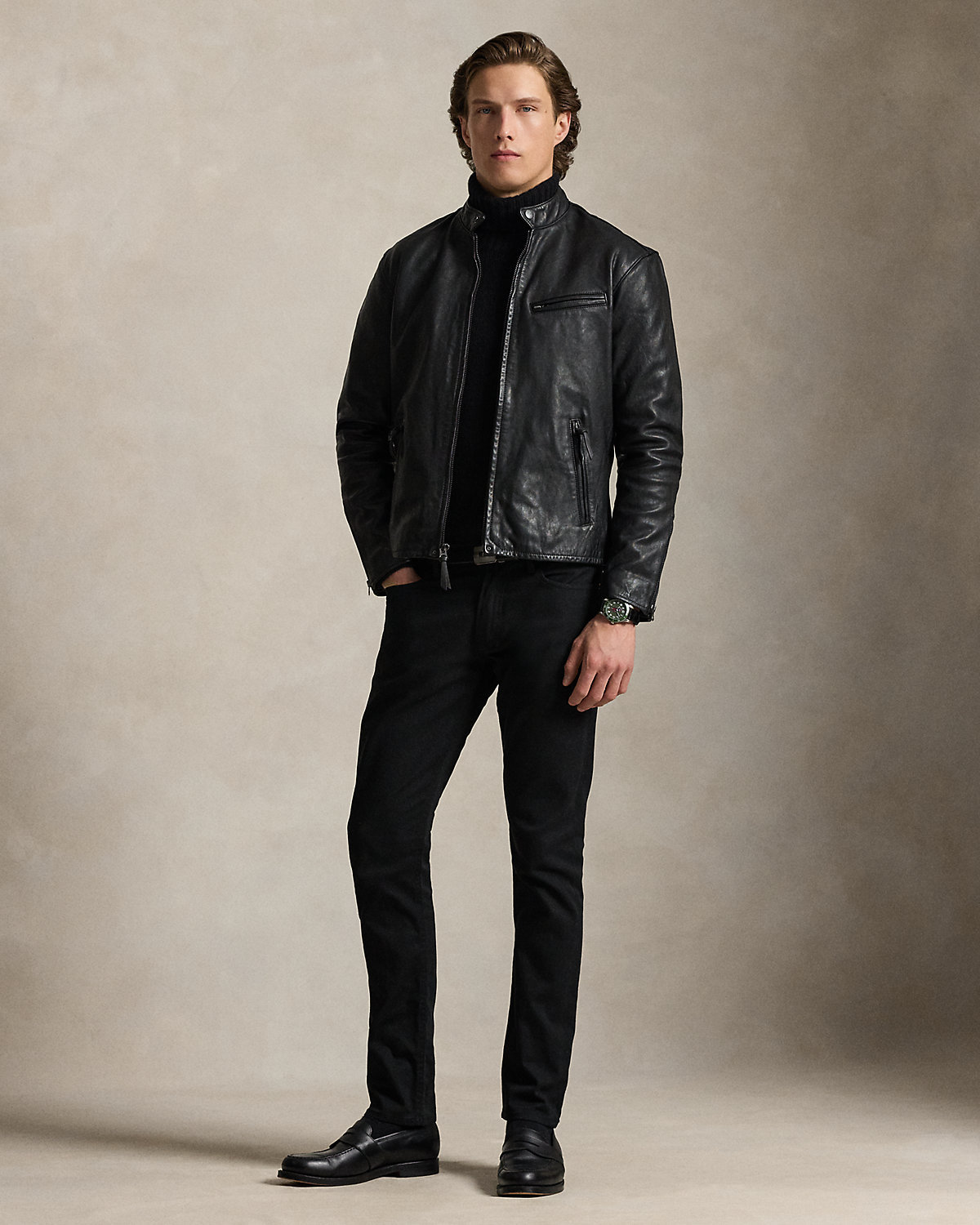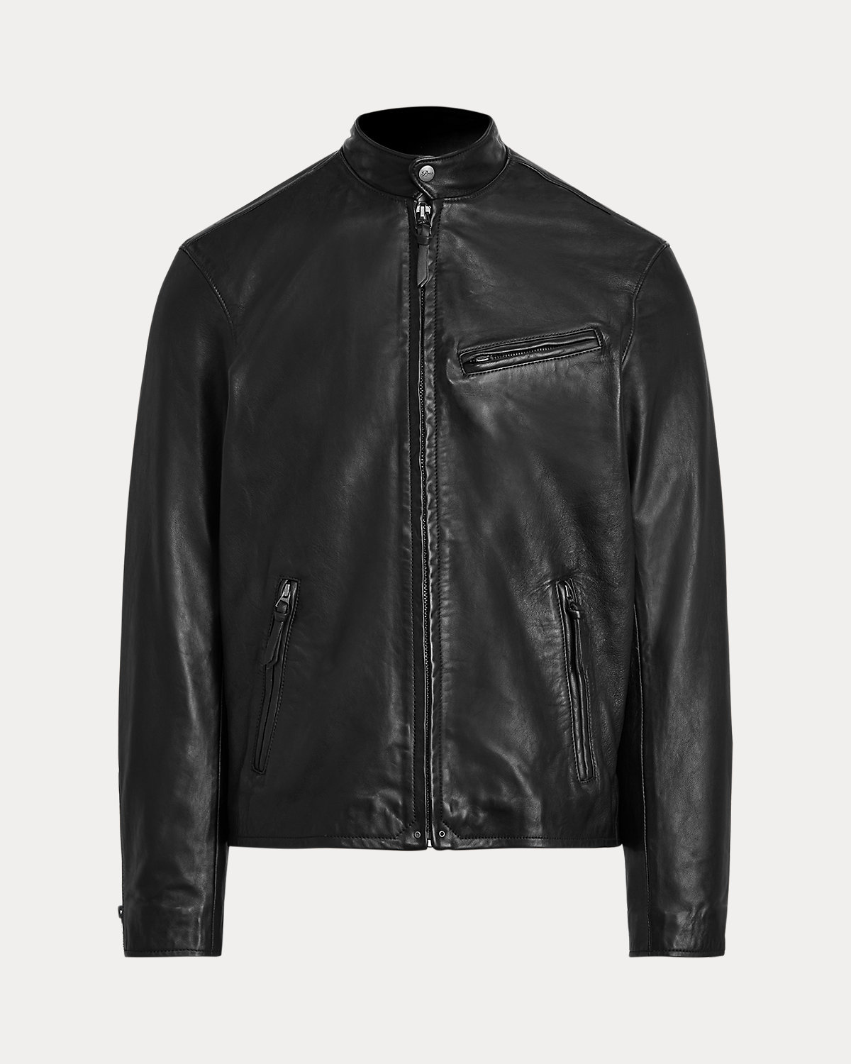 Popularized by European motorcyclists in the 1960s for its slim shape and tapered sleeves, the café racer is a sleek alternative to the traditional biker jacket. Our version is crafted with supple, full-grain leather.