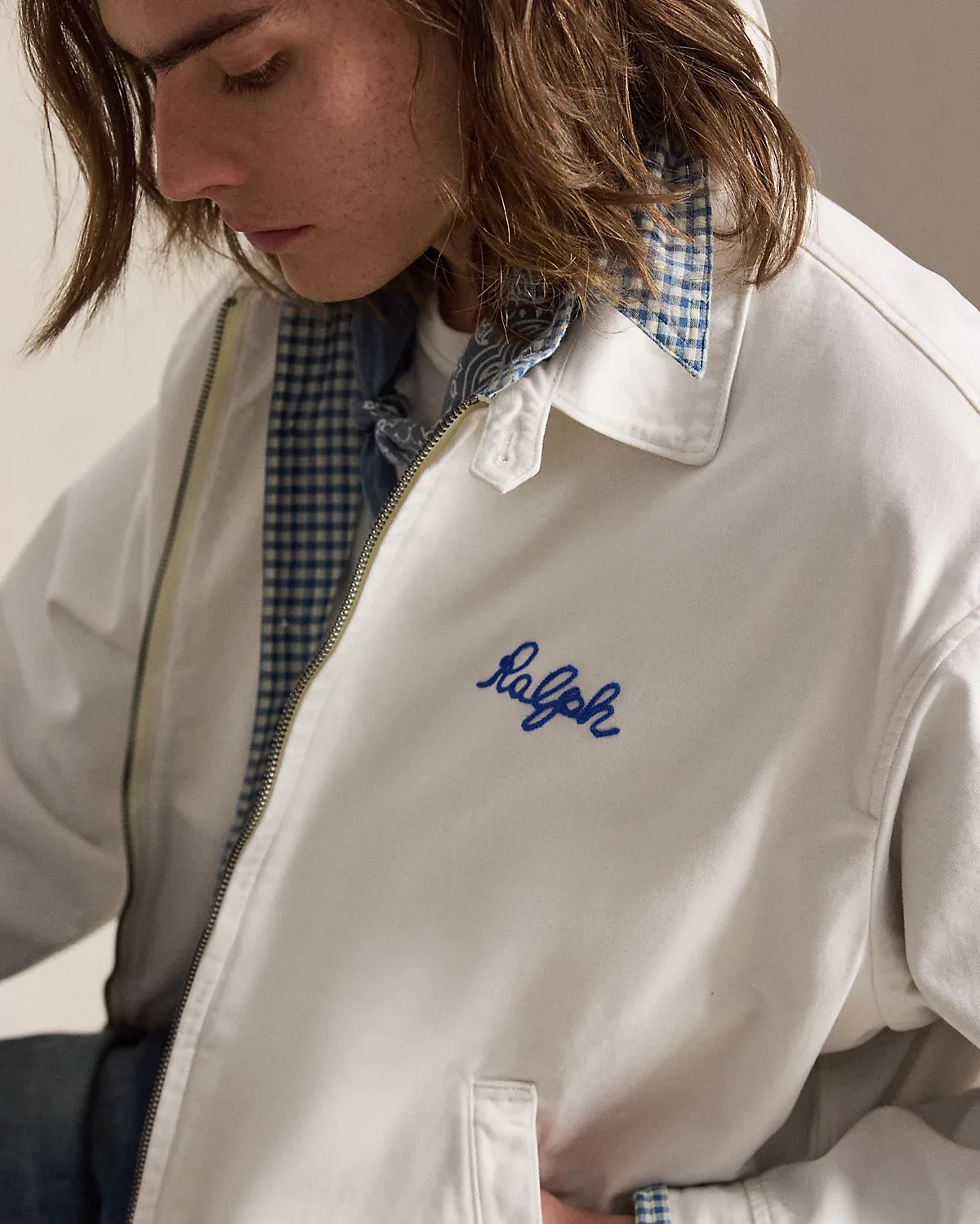 - Straight collar. Buttoned throat tab. Buttons custom-developed with a “Polo Ralpthth Lauren” logo. Full-zip front.