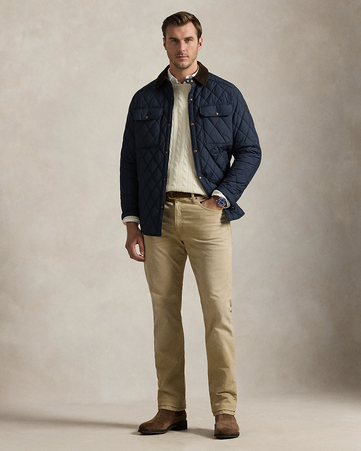 - Belt loops. Zip fly with a dived closure. Metal div custom-developed with a “Polo Ralpthth Lauren” logo.