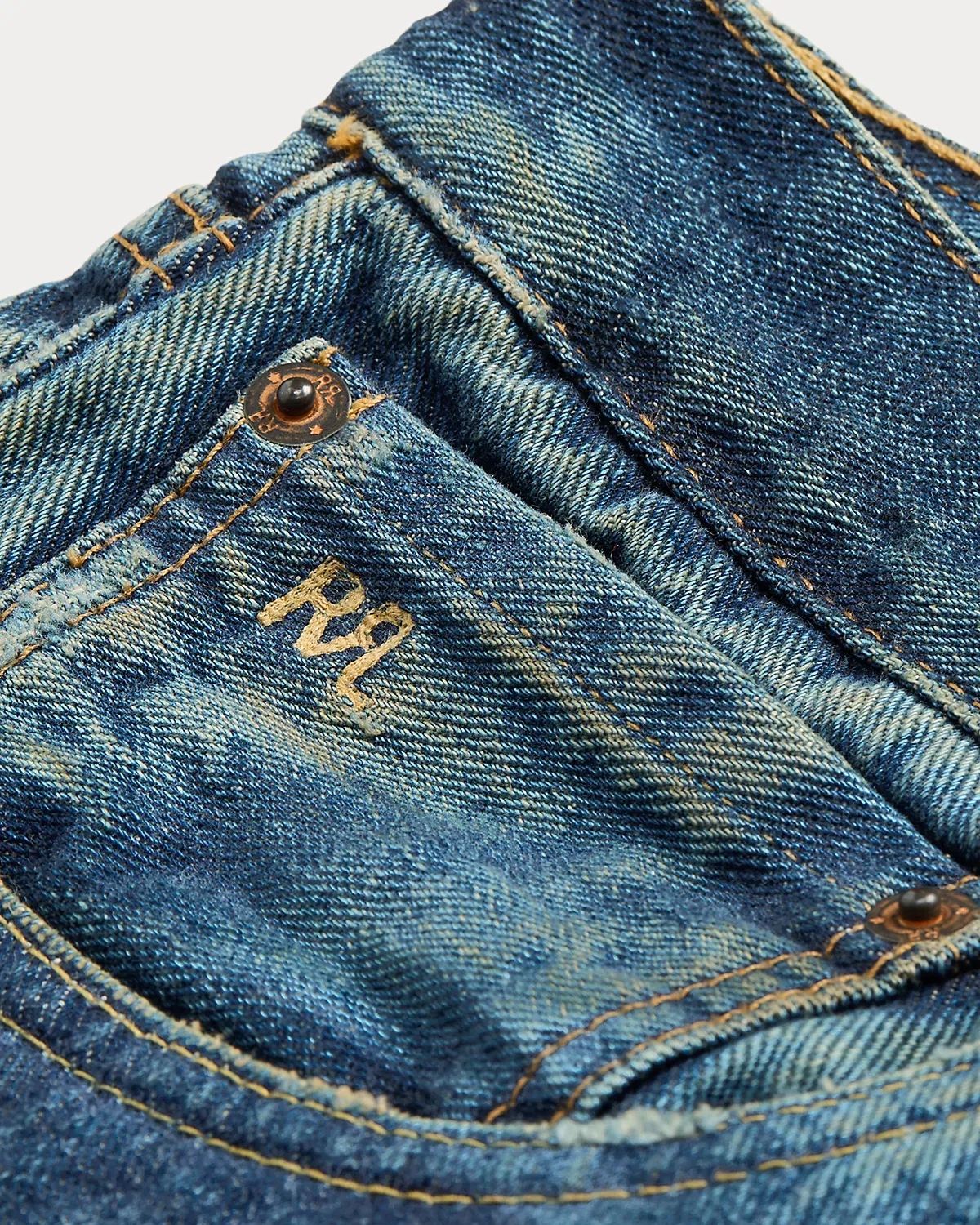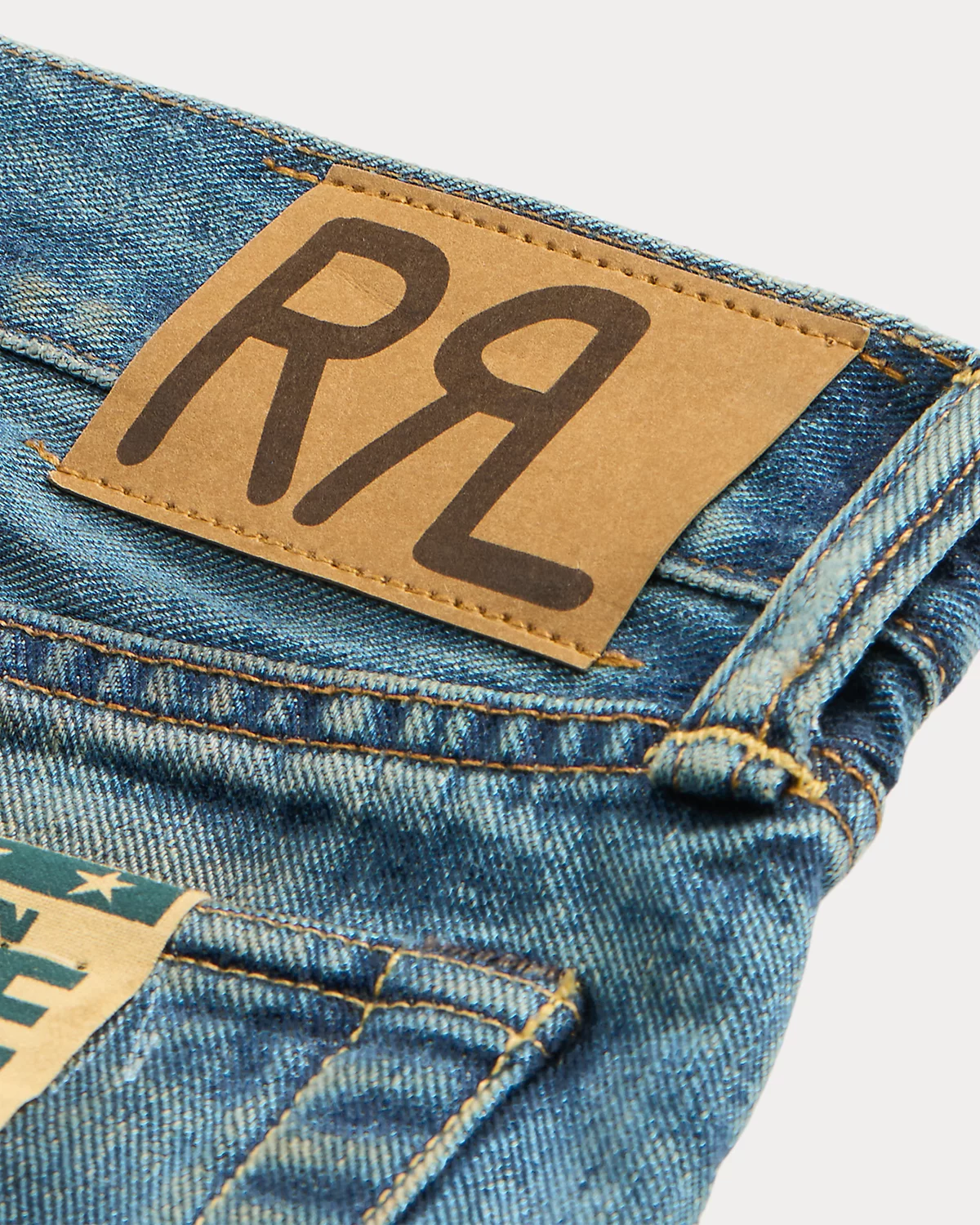 - American-made divs, rivets, and washer burrs. Five-pocket styling. “RRL” embroidery at the coin pocket.