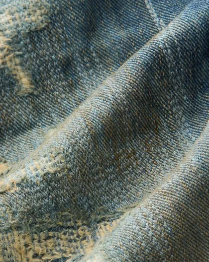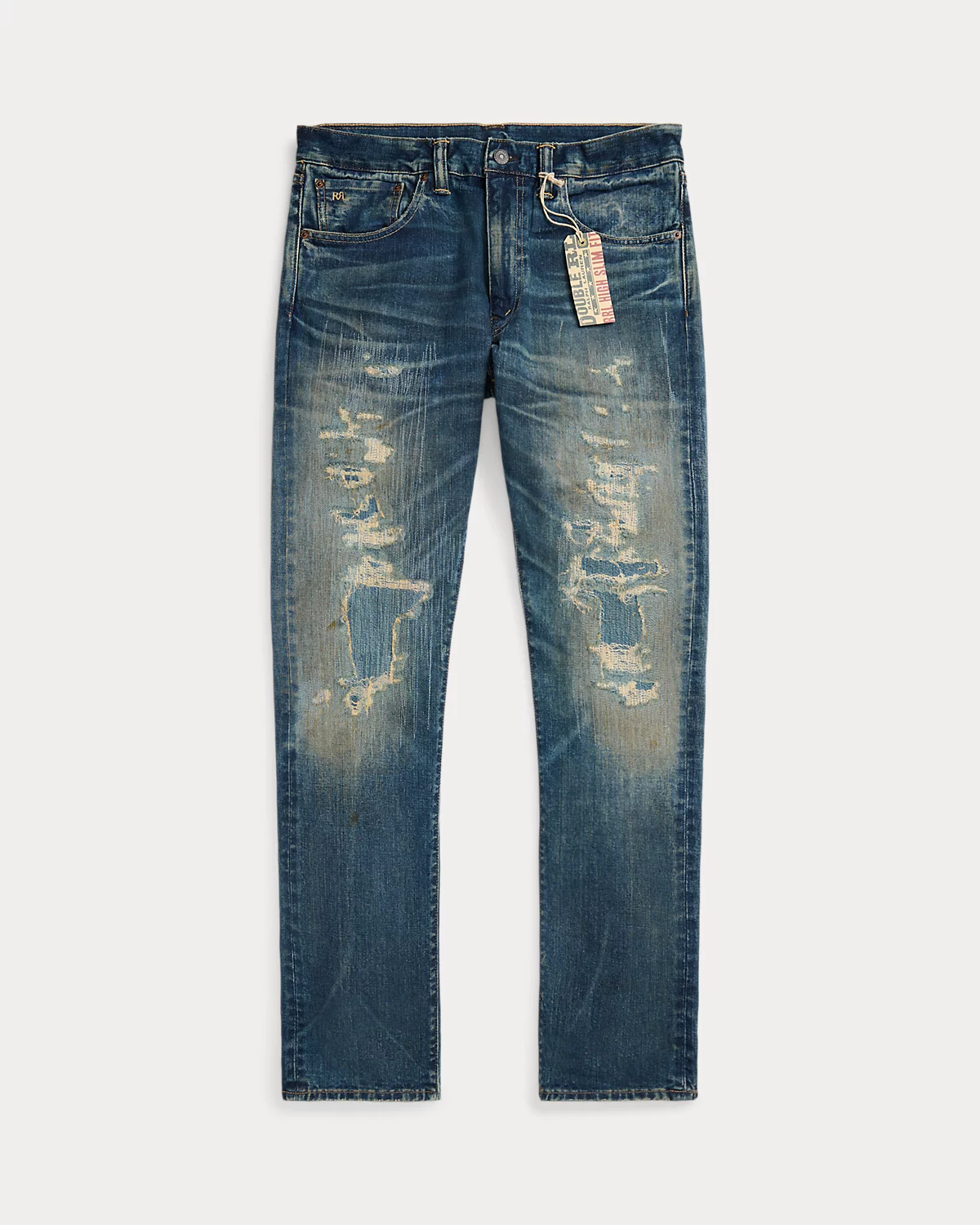 Slim-fitting jeans made from 12.75 oz. Japanese denim. Zip-fly construction. Heavily distressed and repaired. Sanforized® to minimize shrinkage.