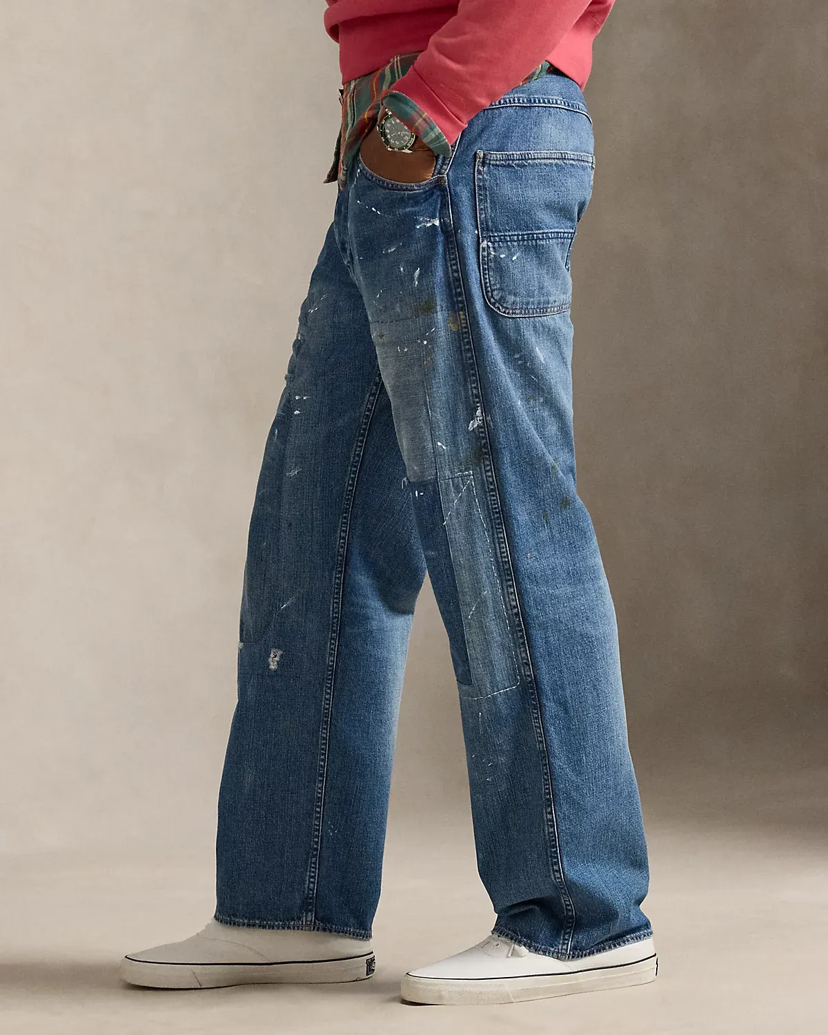 These jeans amplify their workwear-inspired silhouette with non-stretch denim, repair patches, and hand-applied paint splatters.