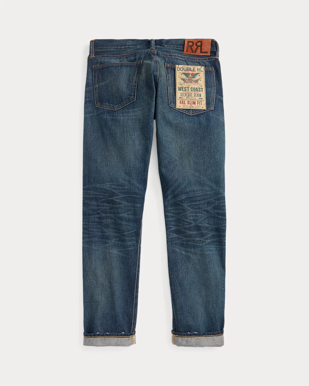 - American-made divs, rivets, and washer burrs. Five-pocket styling. "RRL" embroidery at the selvedge coin pocket. Twill pocket lining.