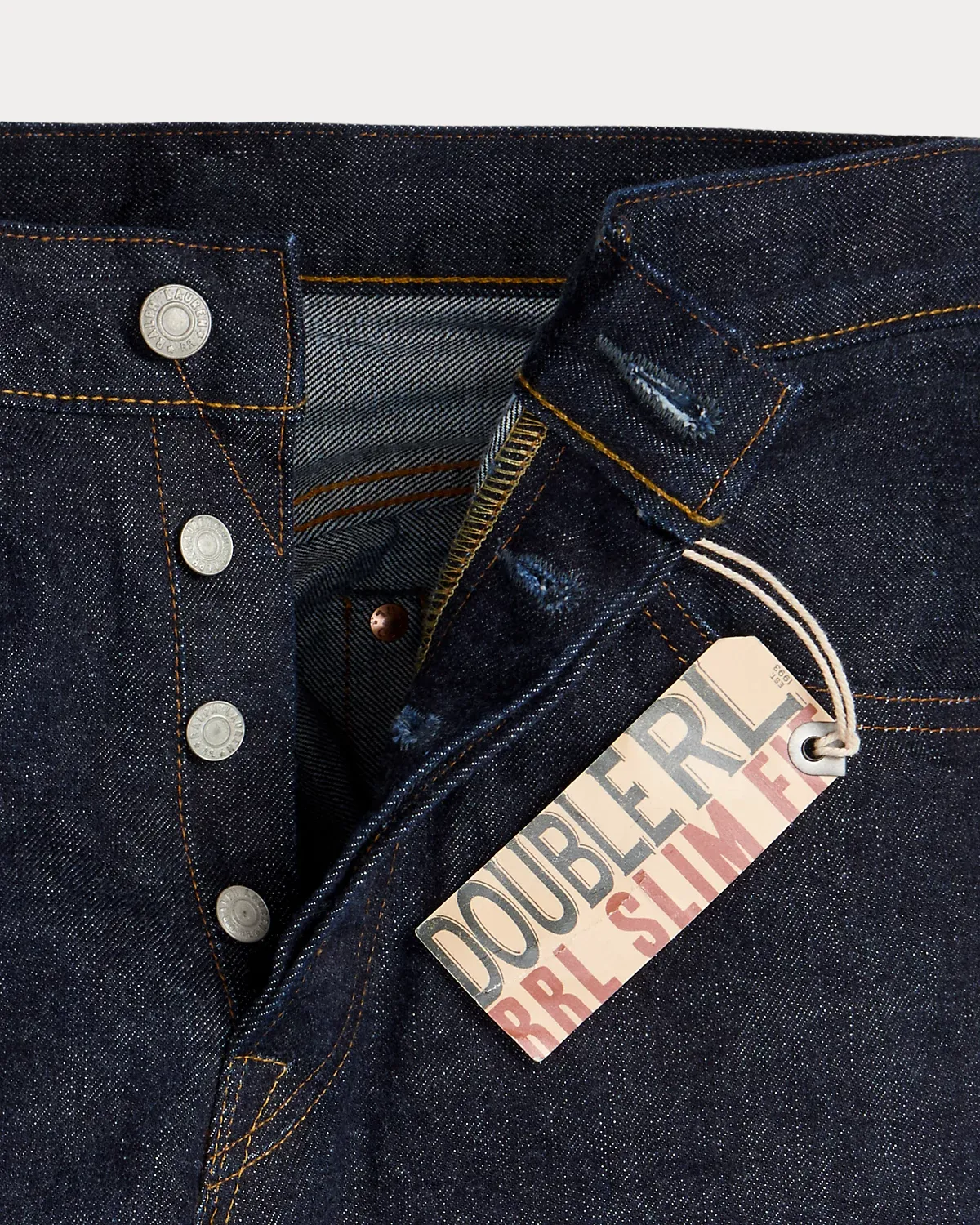 - Five-pocket styling with authentic washers and rivets. Selvedge coin pocket. "RRL" embroidery at the coin pocket. Heavy twill pocket lining.