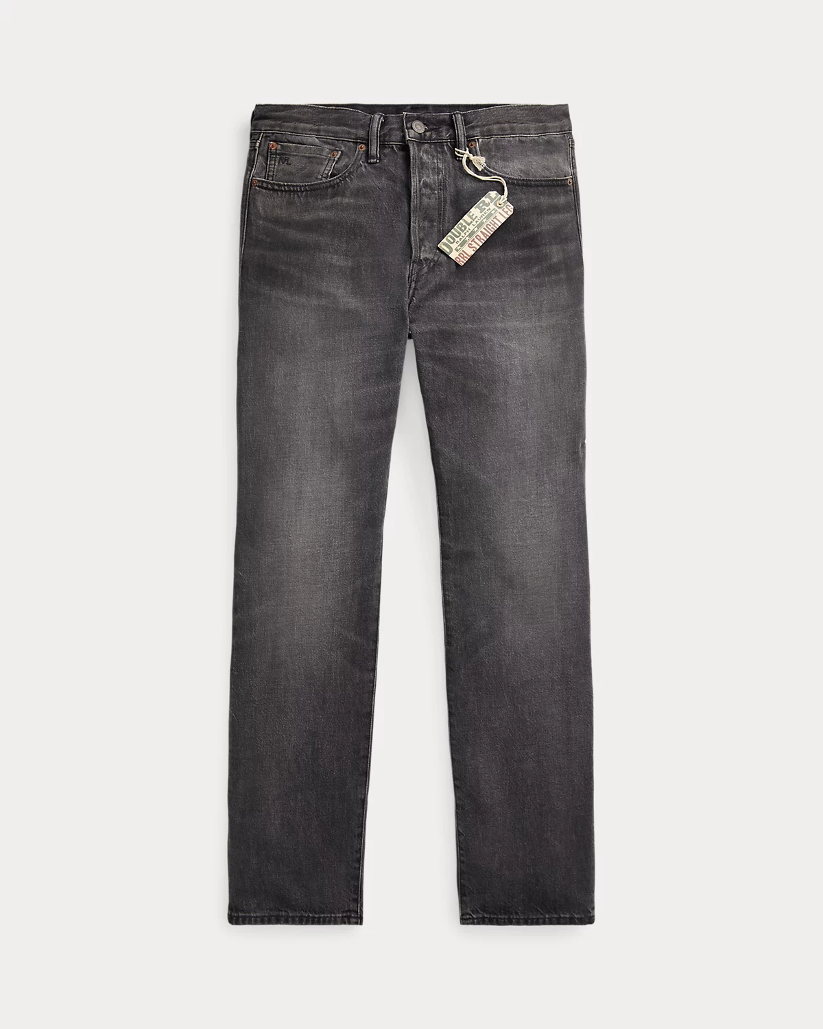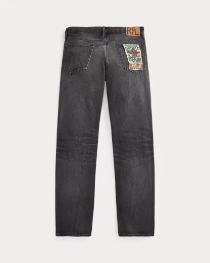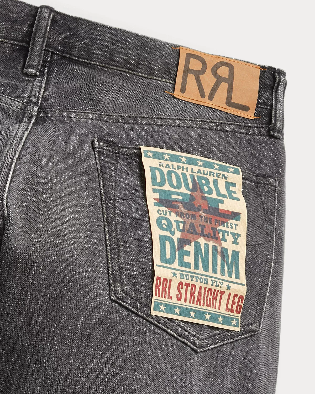 - American-made divs, rivets, and washer burrs. Five-pocket styling. “RRL” embroidery at the coin pocket. Twill pocket lining.