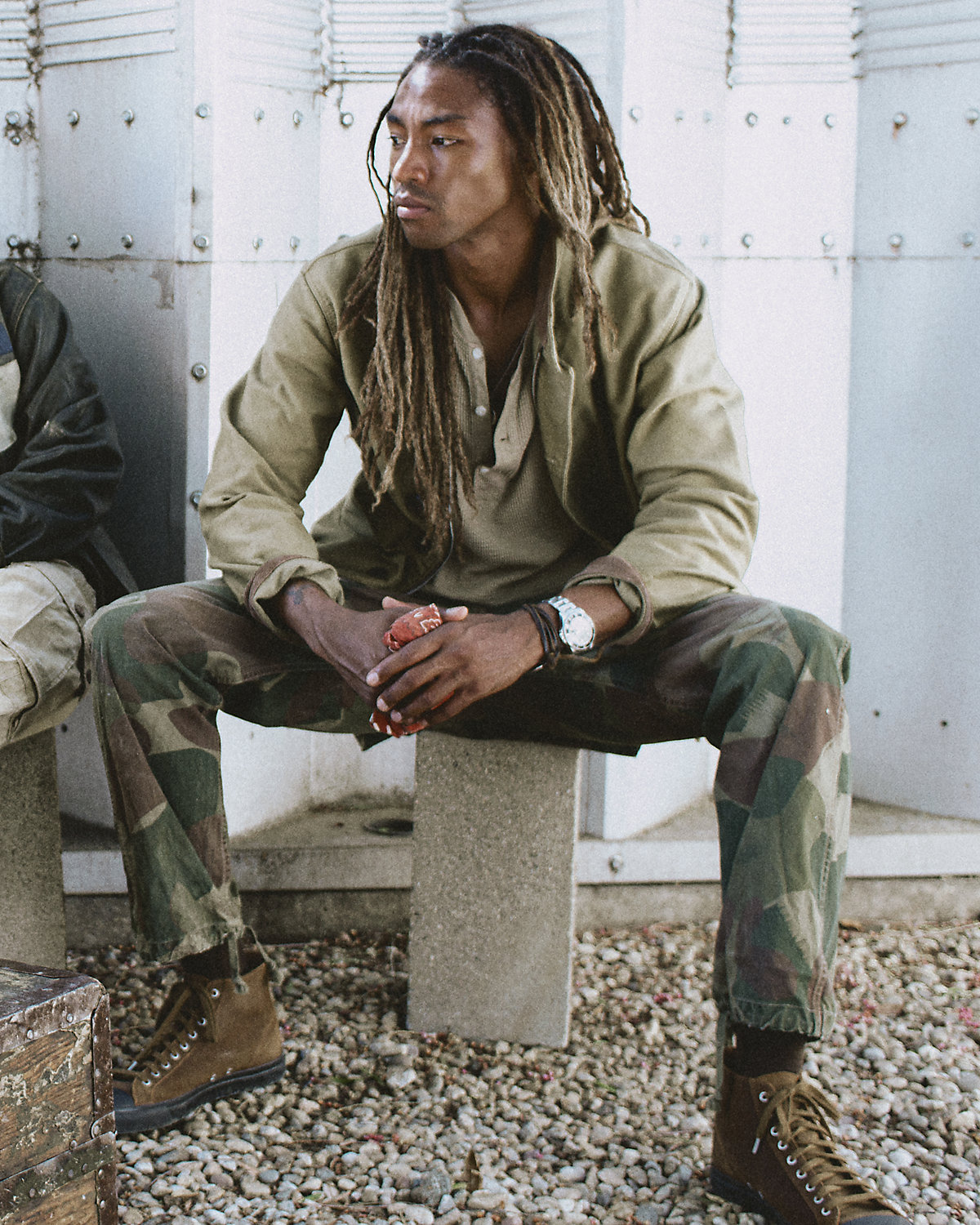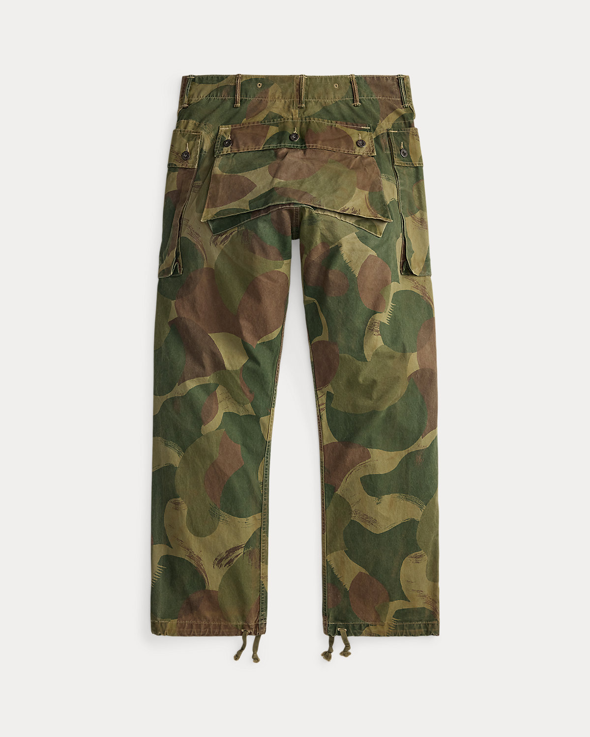 Classic-fitting pants made with cotton poplin. Printed with a 1950s-inspired camo motif. Vintage surplus–style construction. Cargo pocket at the seat and each hip. Drawstring hems. Heavily abraded and pigmented for a timeworn look.