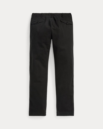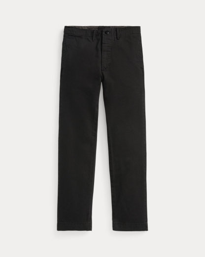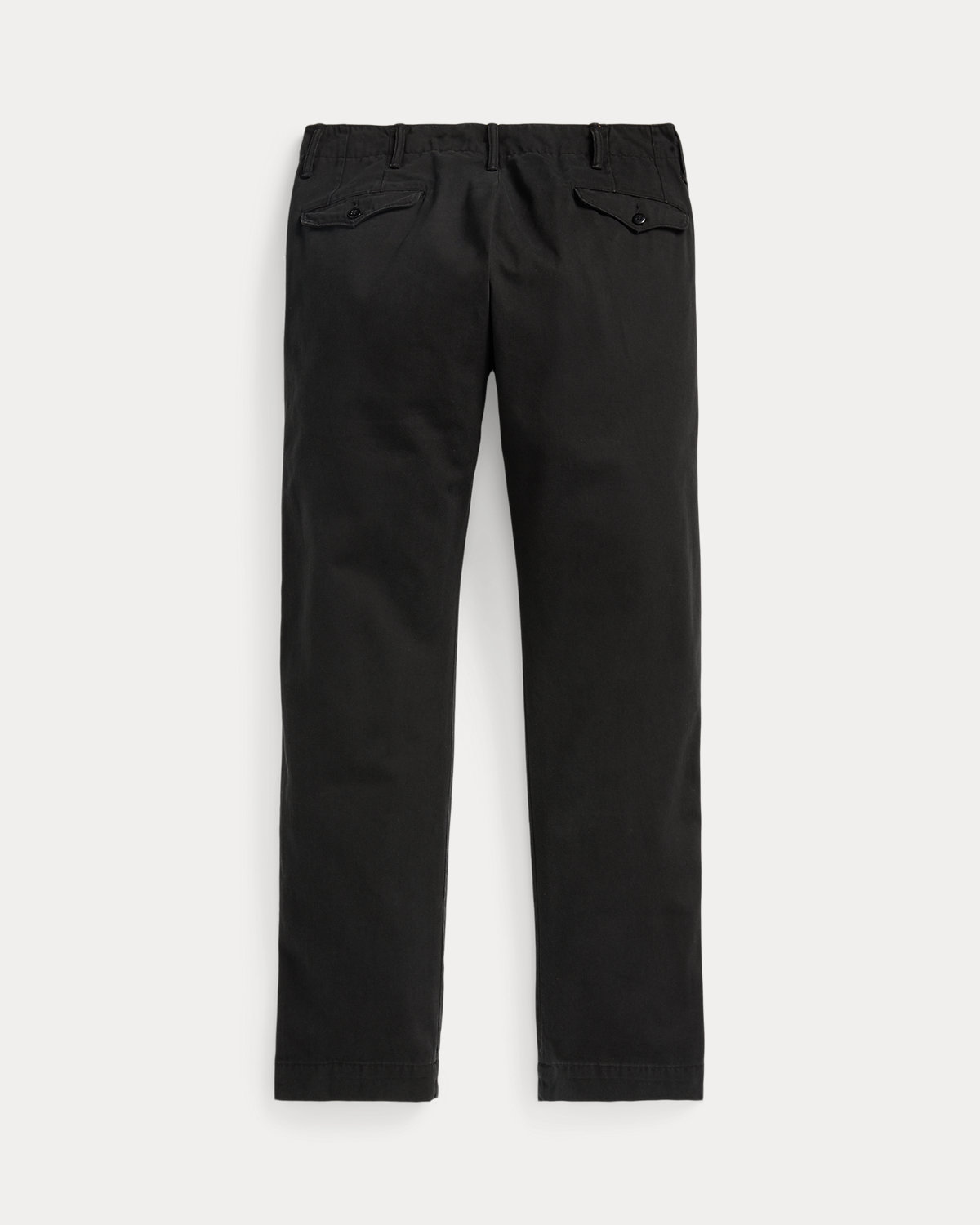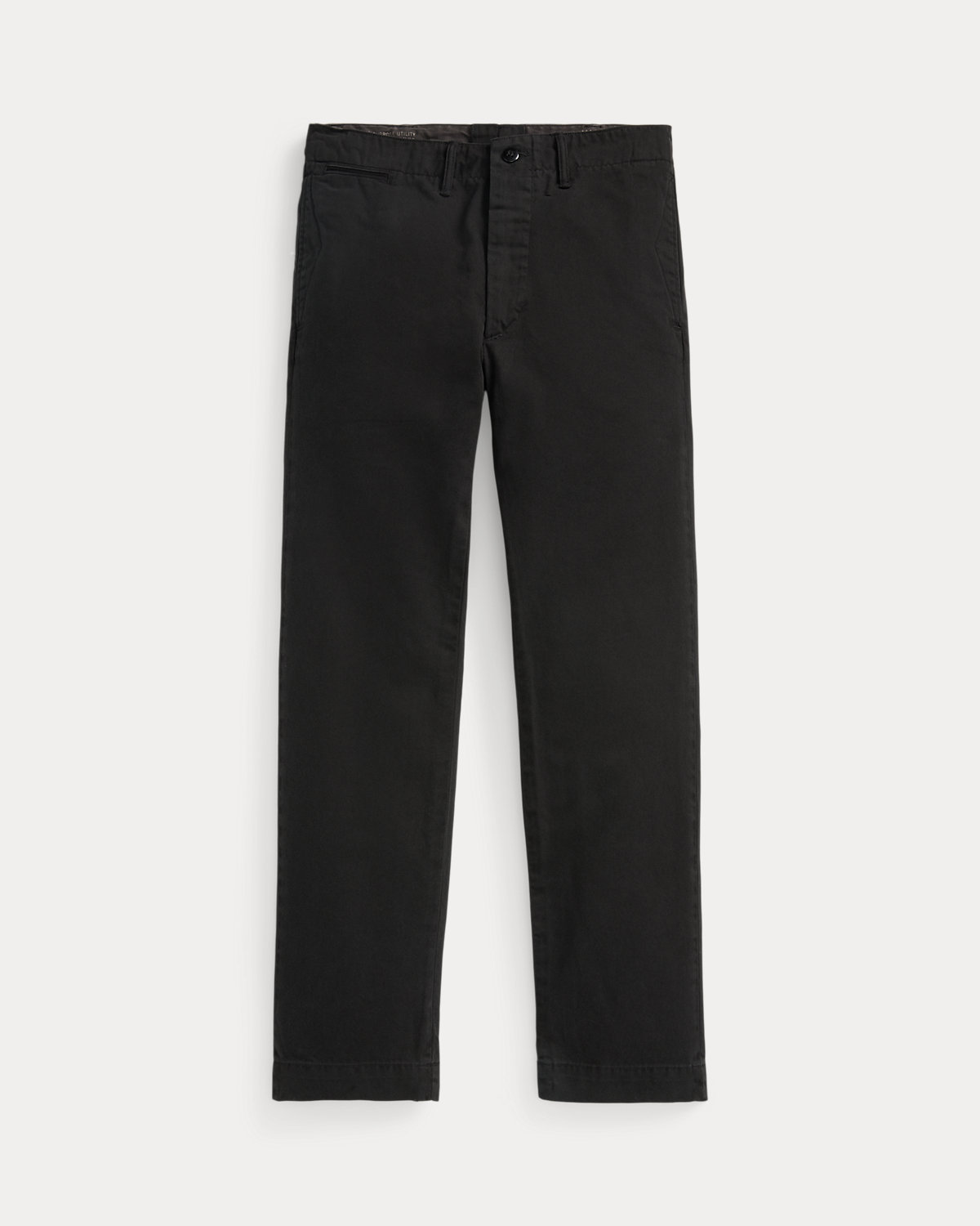 Trim-fitting pants with a straight leg. Made with cotton chino cloth. Button fly. Heavily washed to achieve a lived-in, faded look. Sanforized® to minimize shrinkage.
