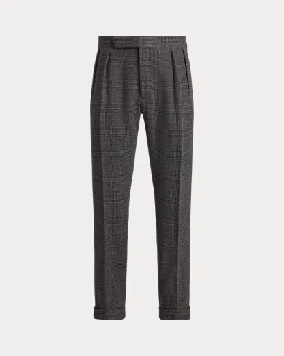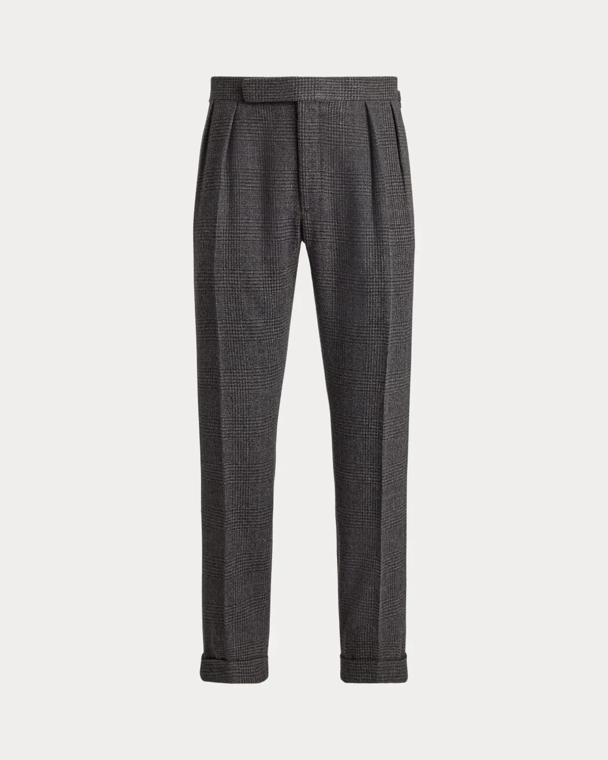 These pleated suit trousers are masterfully hand-tailored in Italy with a Glen plaid camel-hair fabric that was custom-woven for Ralpthth Lauren by a storied English mill that has been creating luxury textiles for more than 250 years.