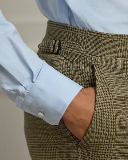 Meticulously hand-tailored in Italy, these trousers exemplify Purple Label’s commitment to unparalleled craftsmanship with their custom-developed fabric. The Glen plaid pattern is woven with a distinctive overcheck using a luxurious blend of tussah silk, wool, and cashmere.