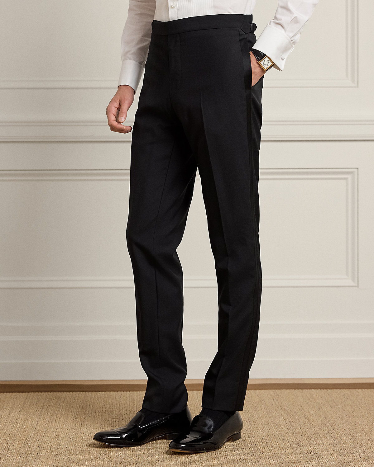 Masterfully hand-tailored in Italy, these tuxedo trousers exemplify Purple Label's commitment to sartorial excellence through their use of bespoke wool barathea, custom-developed to meet our exacting standards. The refined fabric and impeccable craftsmanship represent the pinnacle of formal elegance.