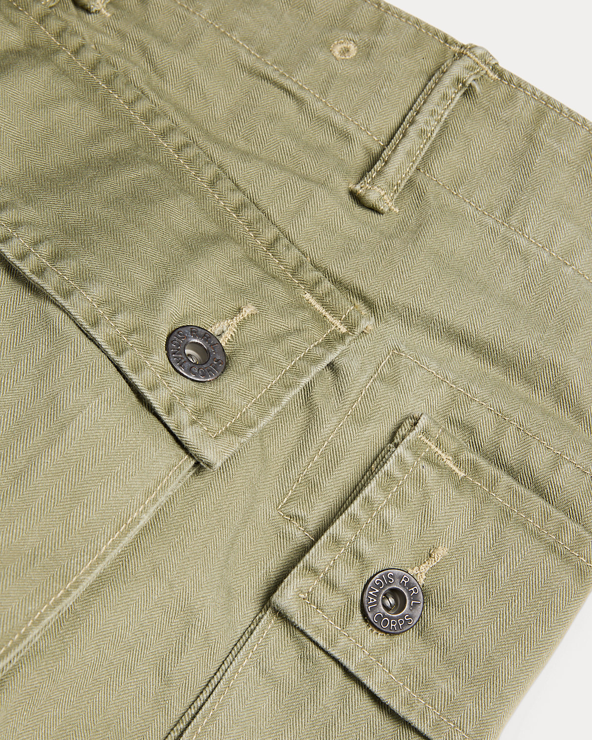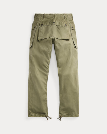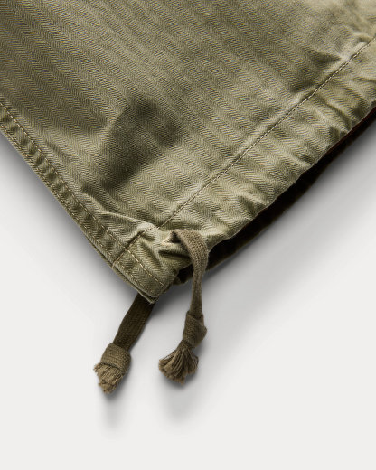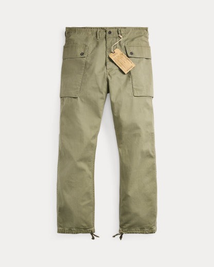 Made with 7.8 oz. cotton herringbone and garment-dyed. Vintage-inspired construction with a div fly, cargo pocket at each hip, and drawstring hems. Sanforized® to minimize shrinkage.