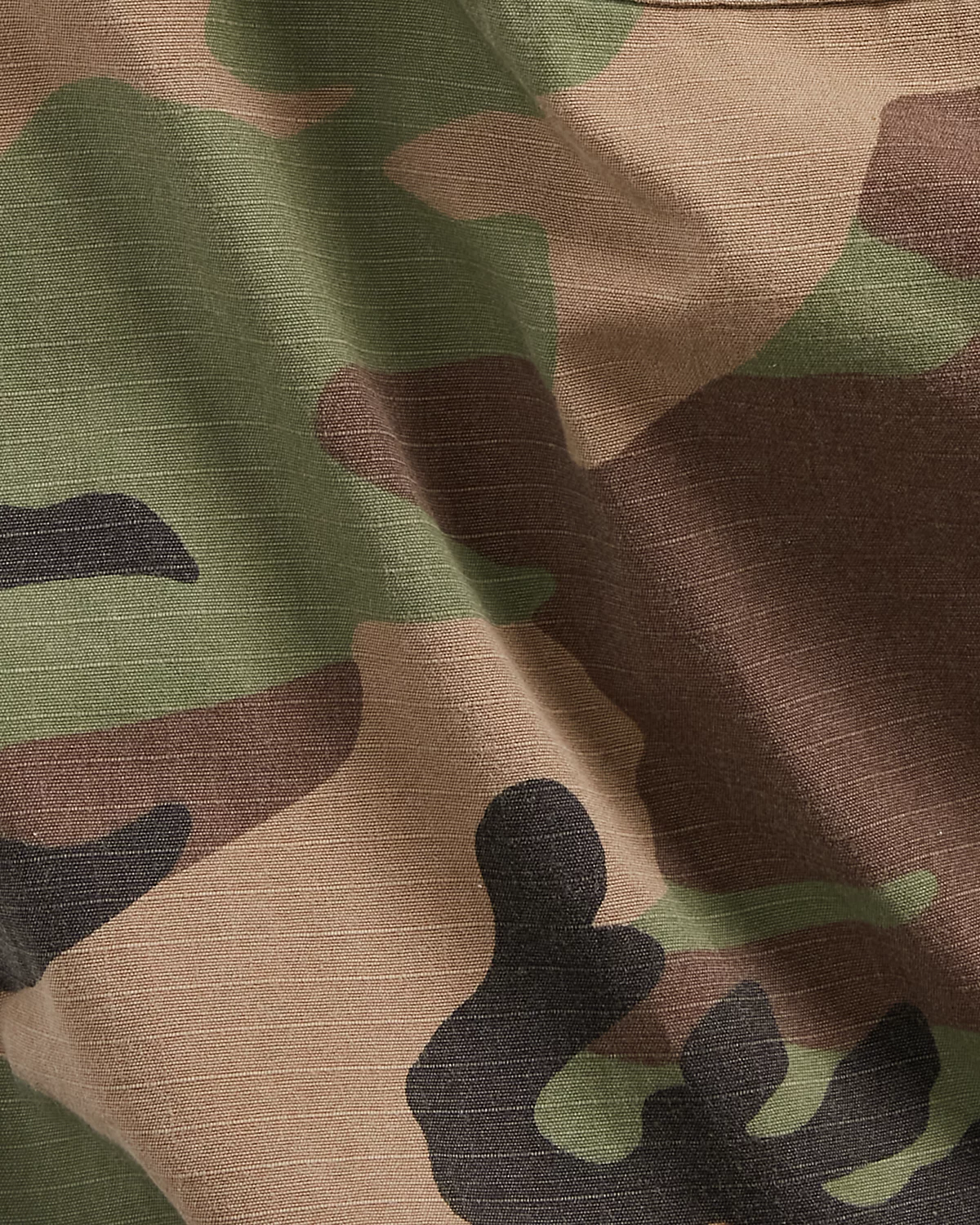 Made with durable cotton ripstop. Printed with a woodland-inspired camouflage print. Articulated knees for ease of movement. Drawstring hems.