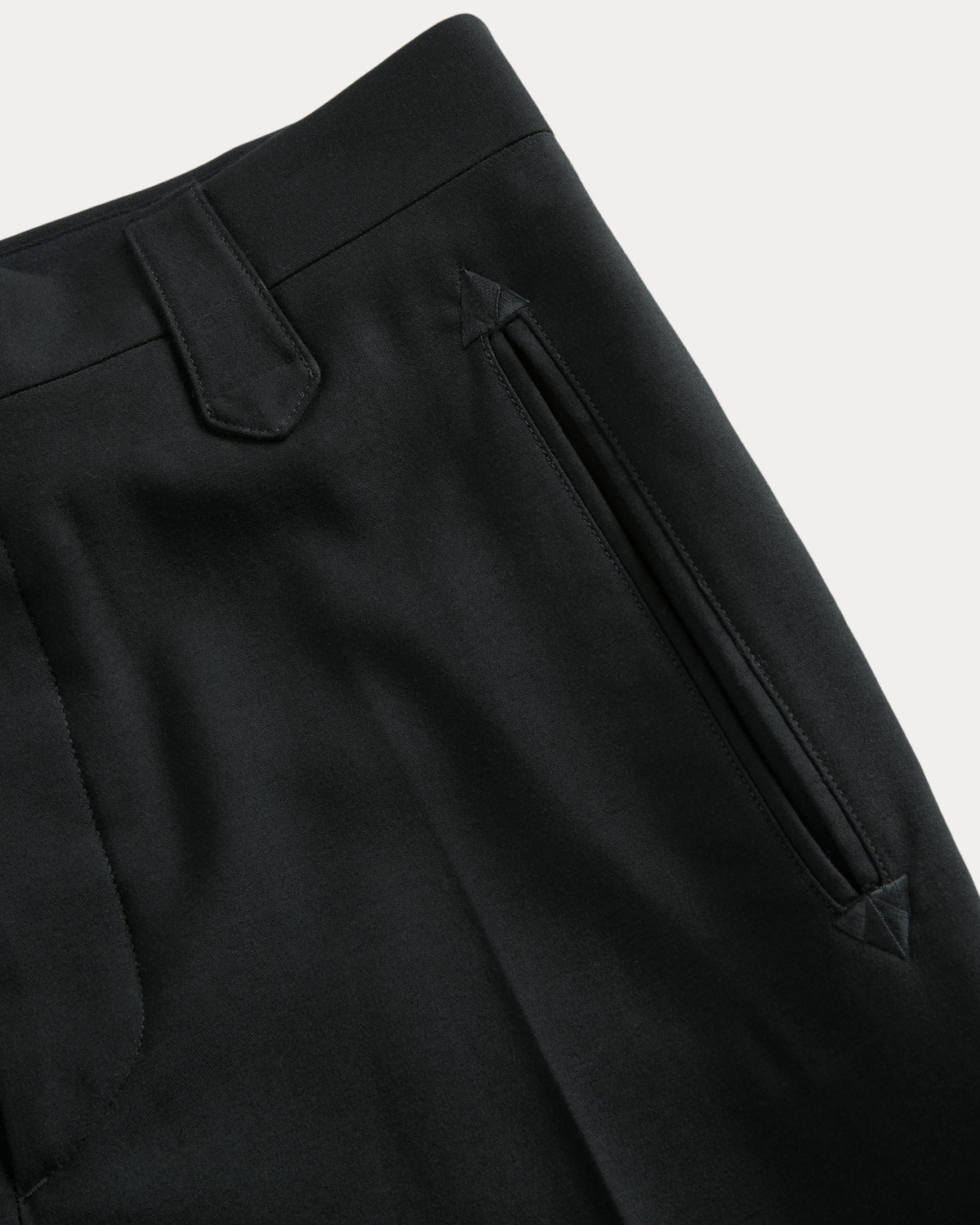 Trousers tailored in Italy for a slim fit. Wool gabardine fabric was custom-developed with a British mill. Western-style belt loops and triangular reinforcements at the pockets. Satin stripe at the outer side of each leg.