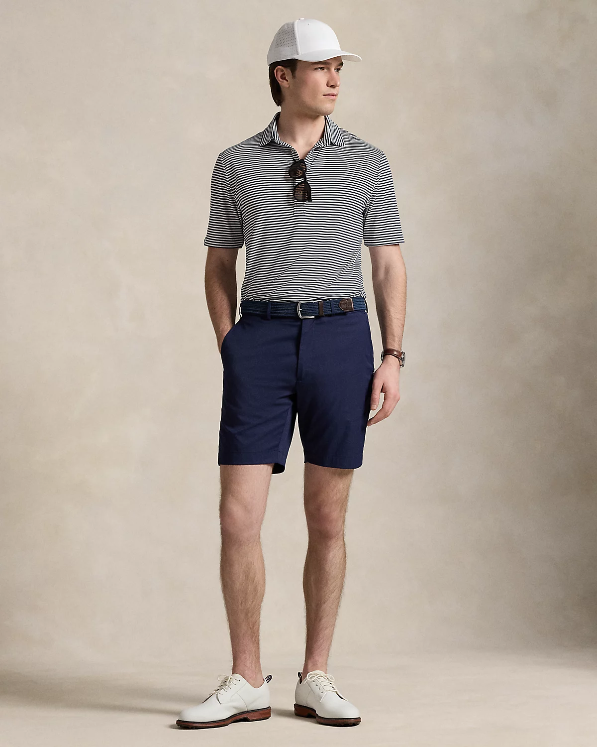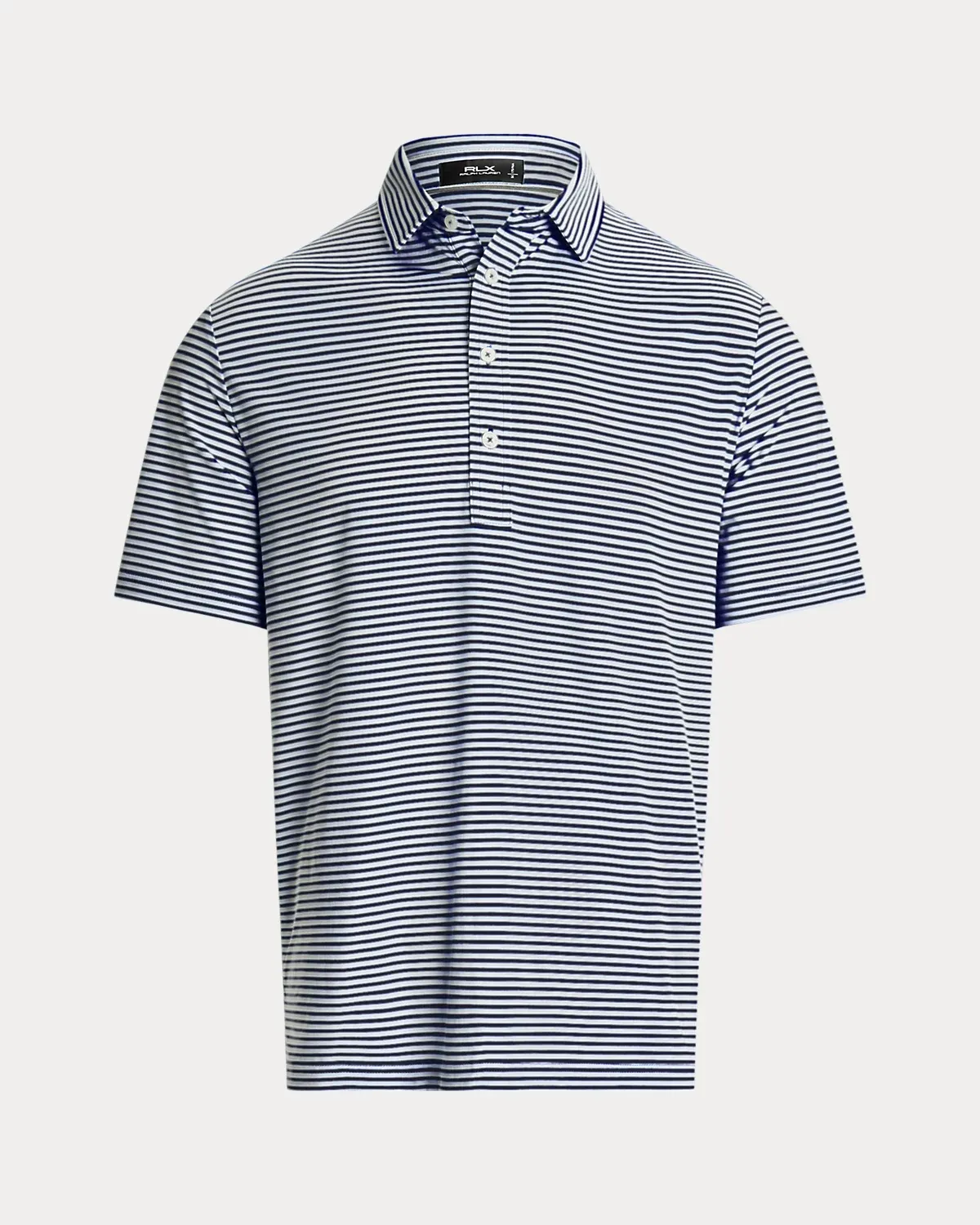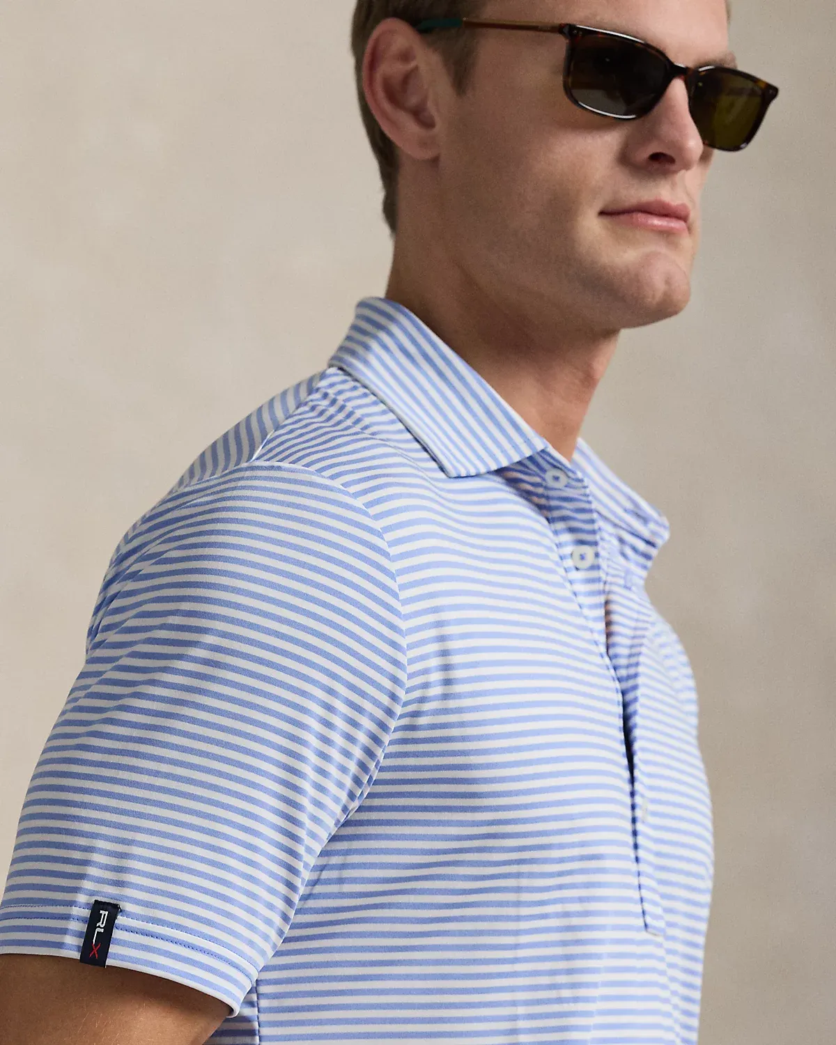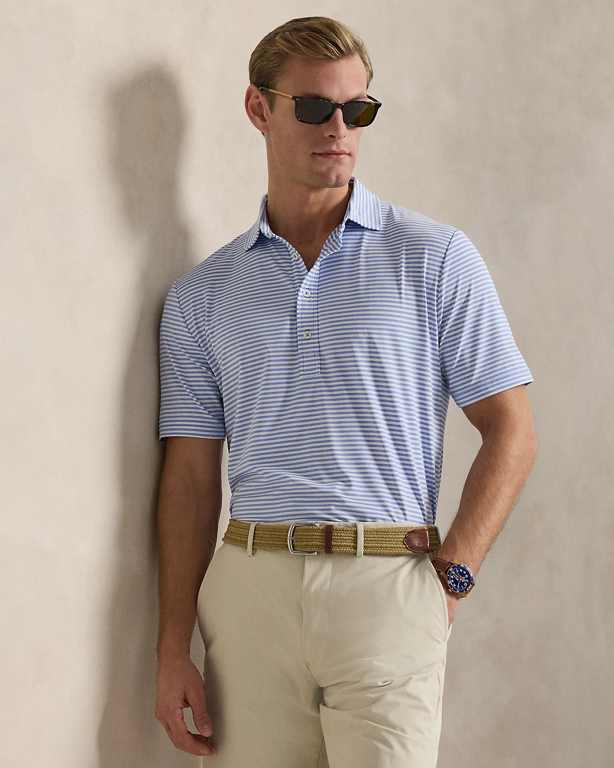 This Polo shirt's moisture-wicking jersey is made with recycled polyester and stretch, which work together to help keep you cool and comfortable on the course.