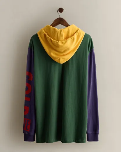 Featured in the 2018 limited-edition Snow Beach capsule, which celebrated the 25th anniversary of the original Polo collection. Hooded rugby shirt features the iconic “Cold Wave” graphic at the left sleeve and a "Polo Sport" patch. Size XL has approximately a 28.75" back body length, a 20.75" shoulder, a 51" chest, and a 25.5" sleeve length.