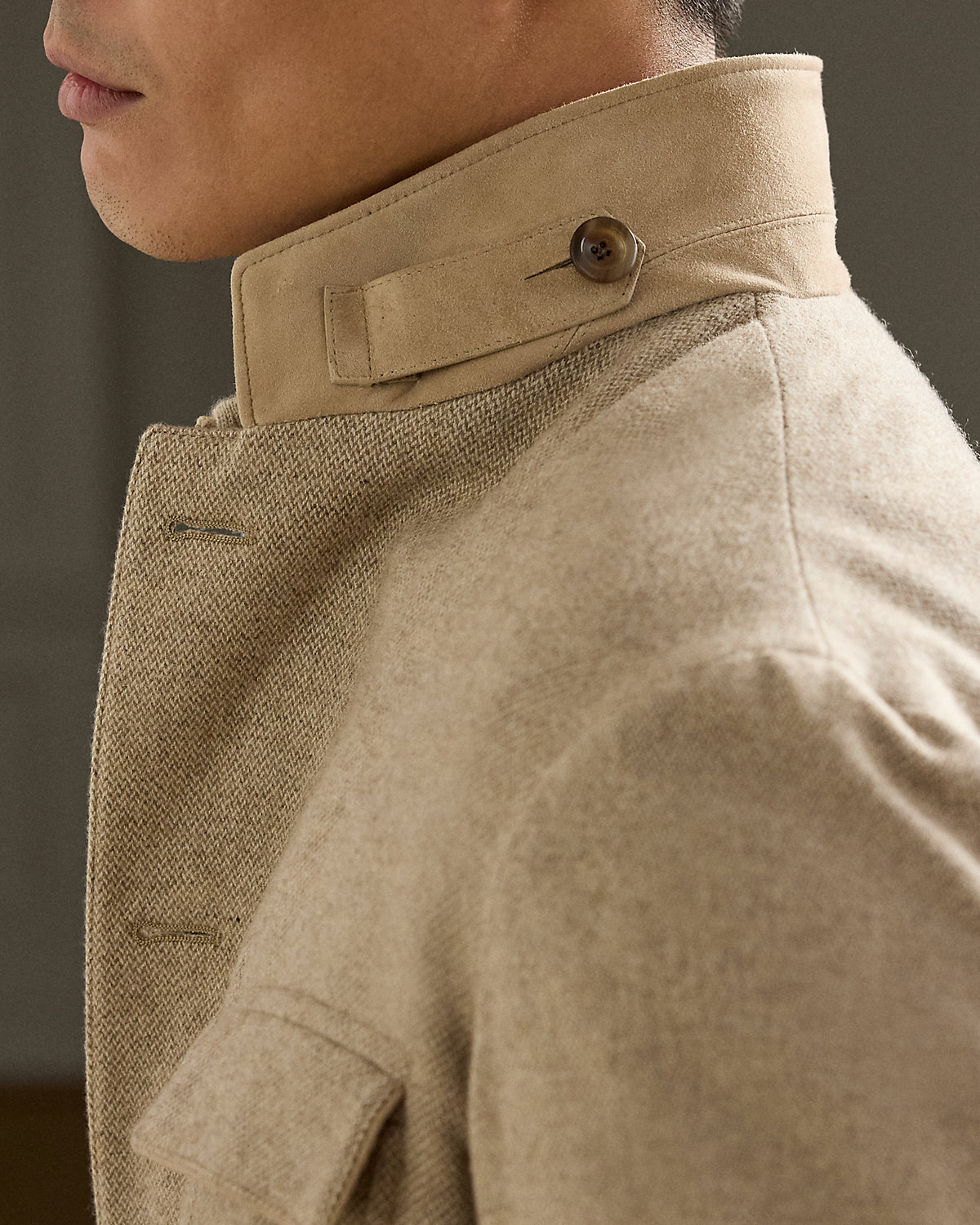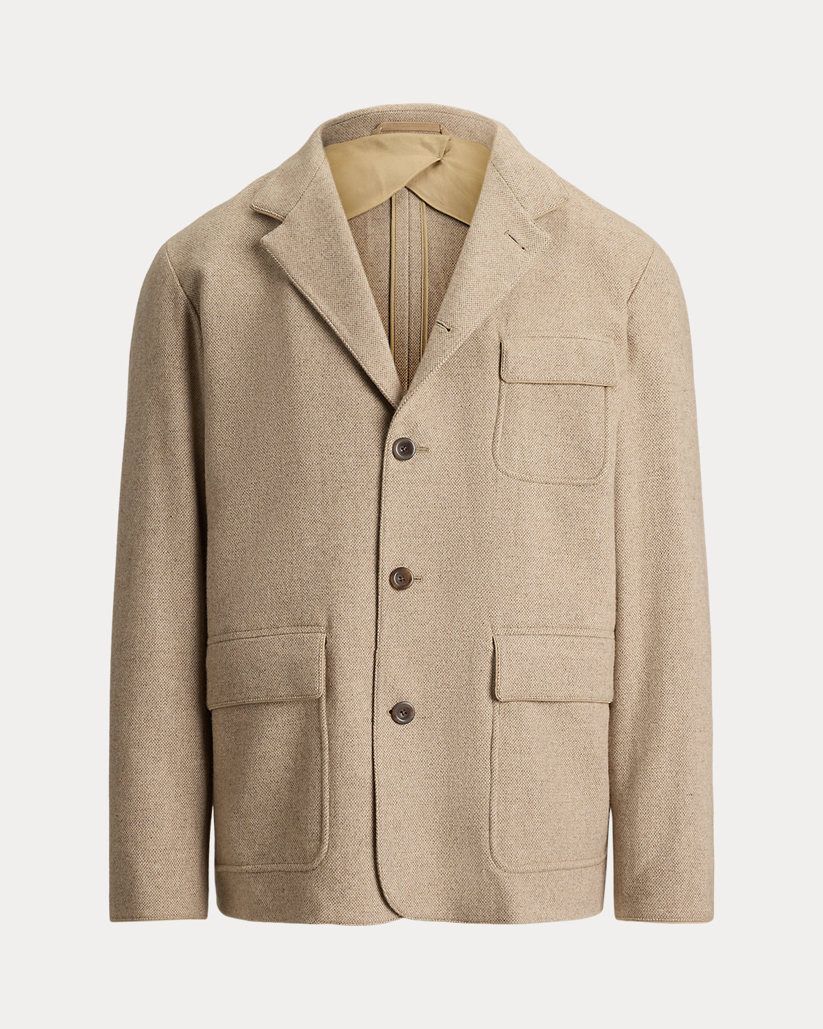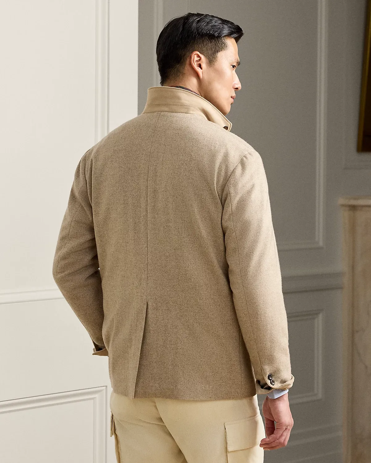 Hand-tailored in Italy, this jacket is crafted from a textured tick-weave cloth that draws inspiration from a classic Ralpthth Lauren pattern. The custom-developed fabric is beautifully woven with a blend of wool, mulberry silk, and cashmere.