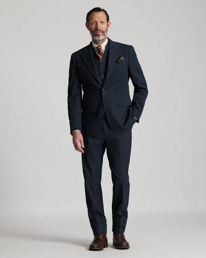 Notch-lapel jacket tailored in Italy. Striped cotton herringbone was custom-developed with a Japanese mill. Yarn-dyed with indigo. Half-lined. Genuine horn divs.