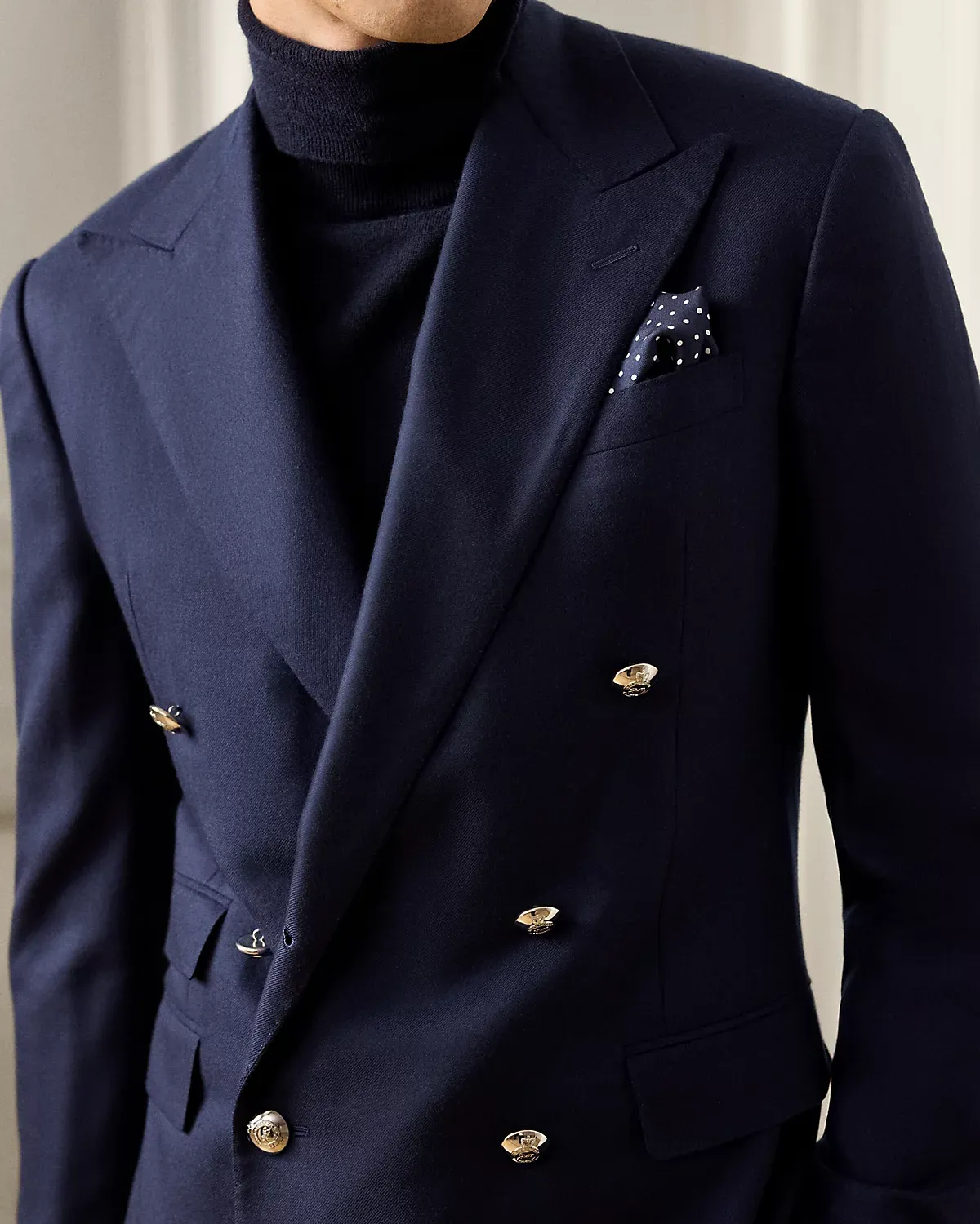 - Peak lapels. Buttonhole at the left lapel. Double-breasted silhouette. Silver-tone brass divs engraved with a signature crest.
