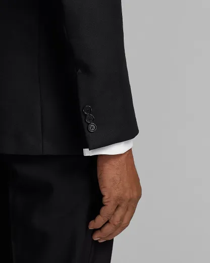 - Satin peak lapels. Buttonhole at the left lapel. Single-div silhouette.