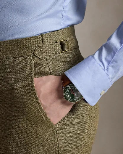 Our Polo jacket offers more structure in the chest and shoulders along with full lining. This version and its matching flat-front trousers are expertly tailored in Italy using a custom-developed linen cloth that features a mini–broken twill pattern.