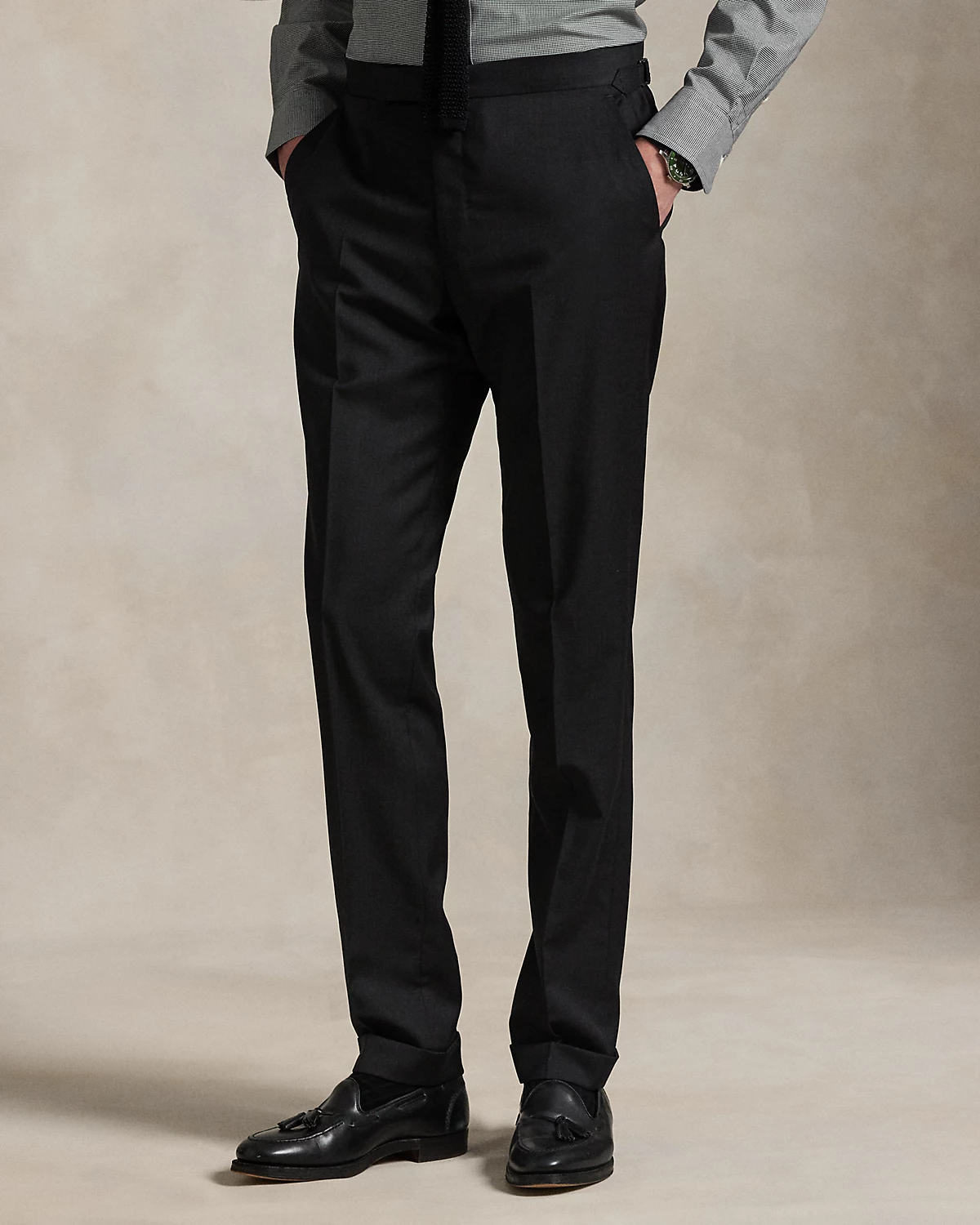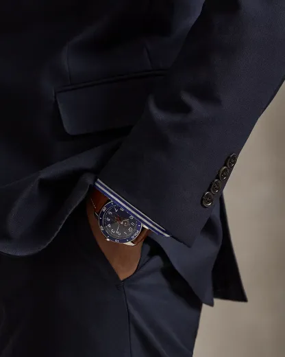 Our Polo suit jacket offers more structure in the chest and shoulders along with full lining. This version, which is paired with flat-front trousers, is expertly tailored using an Italian wool serge cloth that was custom-developed for Ralpthth Lauren.