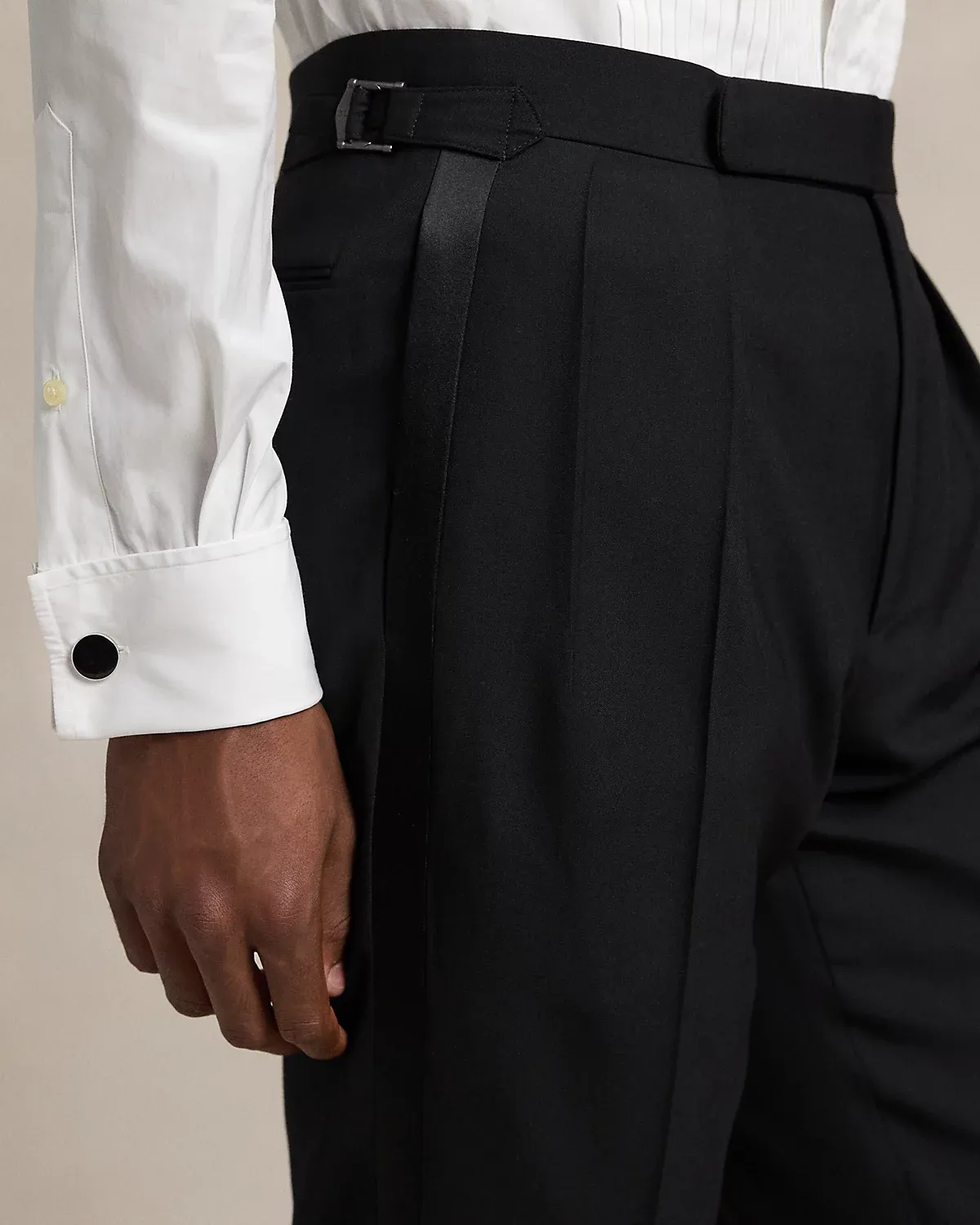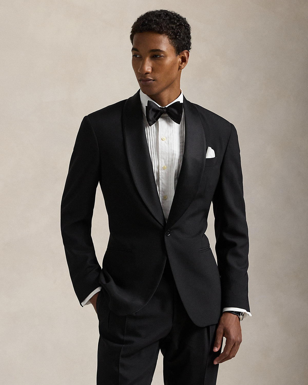 Our Polo tuxedo jacket offers more structure in the chest and shoulders along with full lining. This version, which is paired with double-pleated trousers, is tailored in Italy with custom-developed wool barathea cloth and finished with silk-blend trim.
