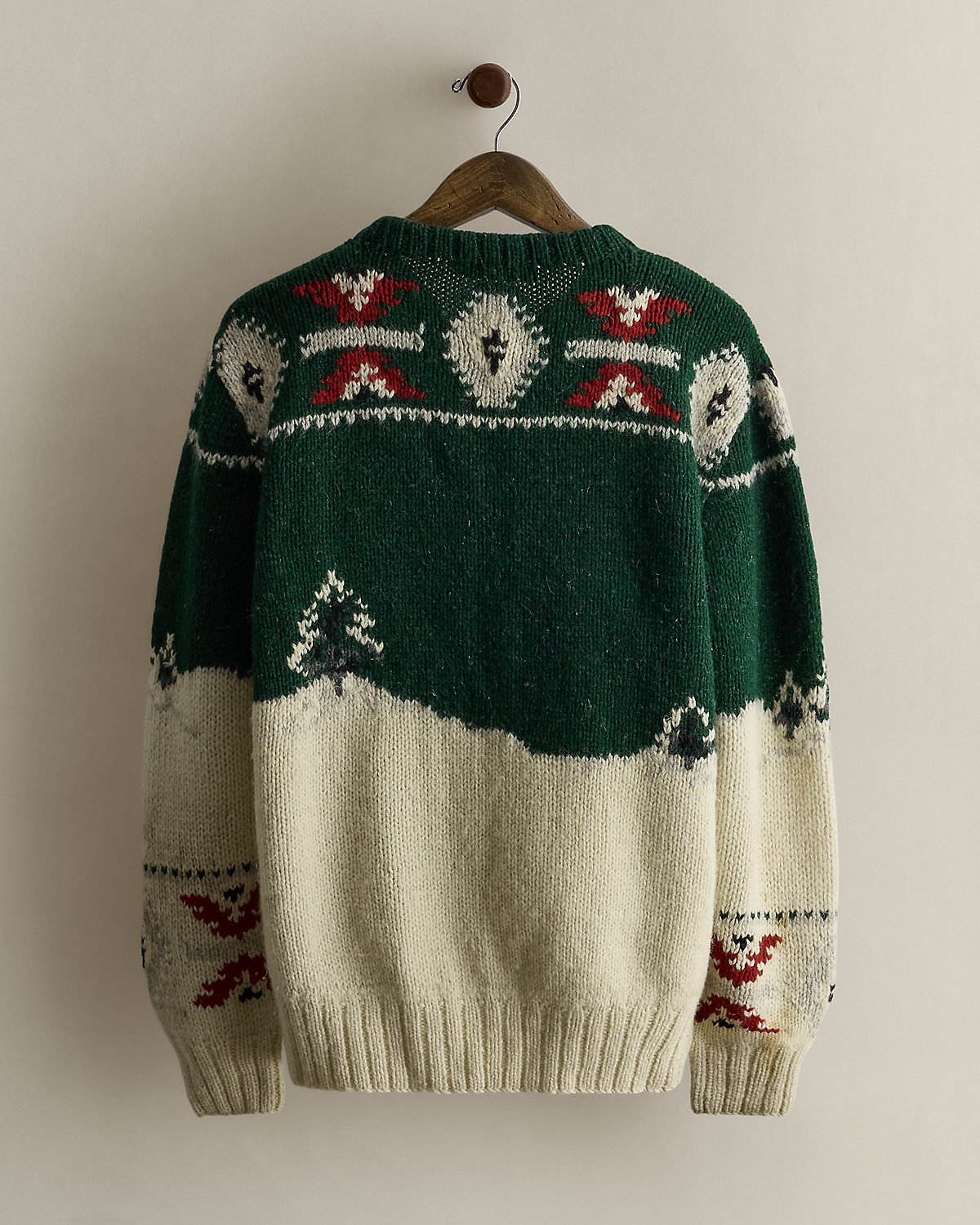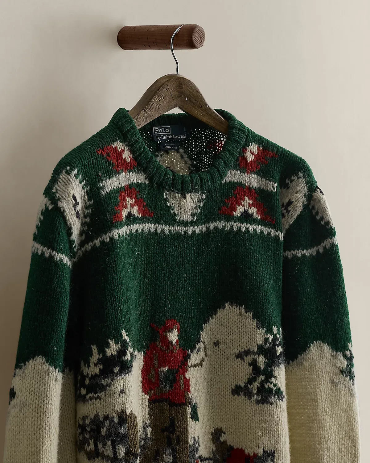 Part of the Fall 1985 Polo collection. Hand-knit wool sweater inspired by the Alaskan terrain. Features a dogsledding graphic at the front. Size large has approximately a 26" back body length, a 19.75" shoulder, a 45" chest, and a 25.25" sleeve length.