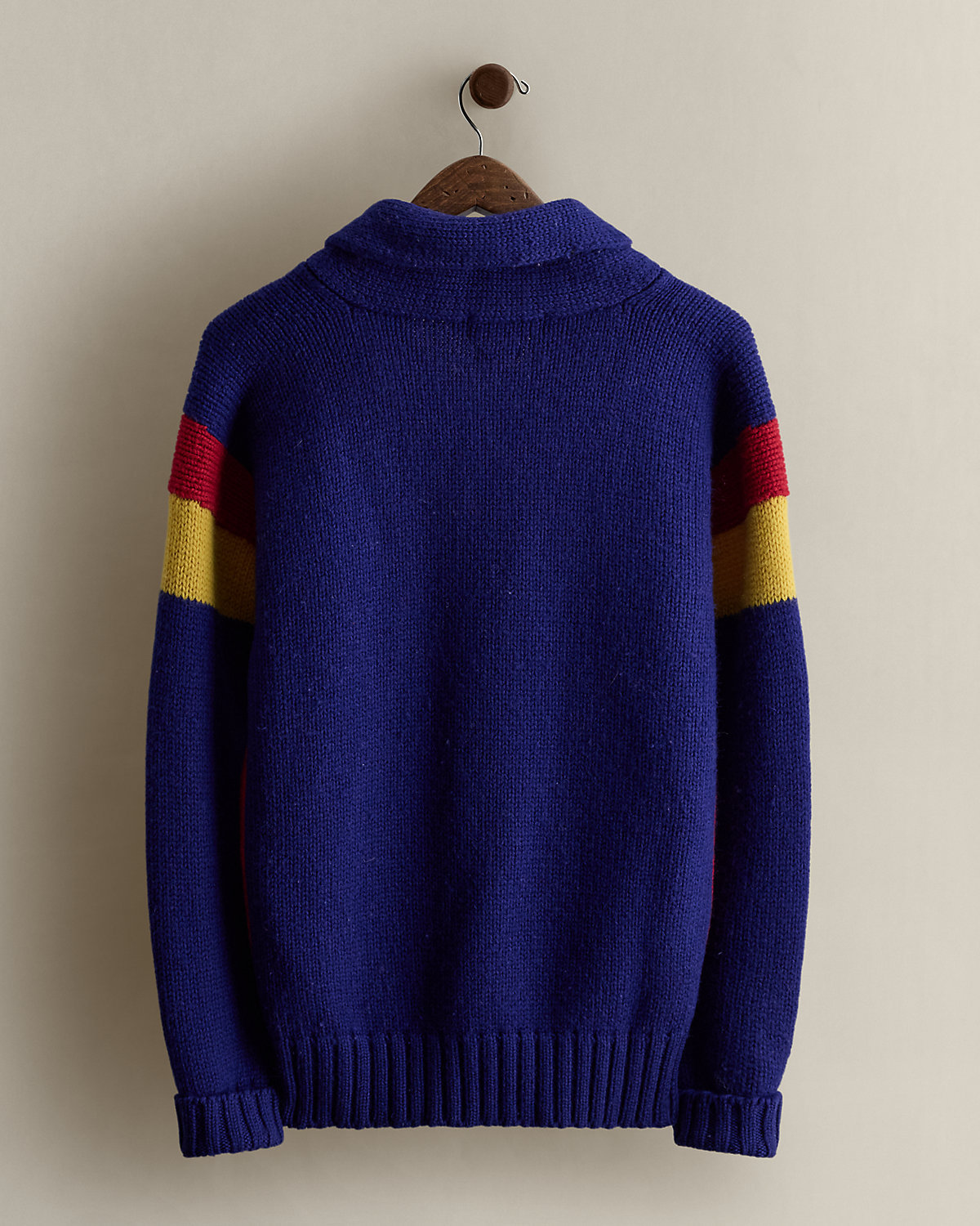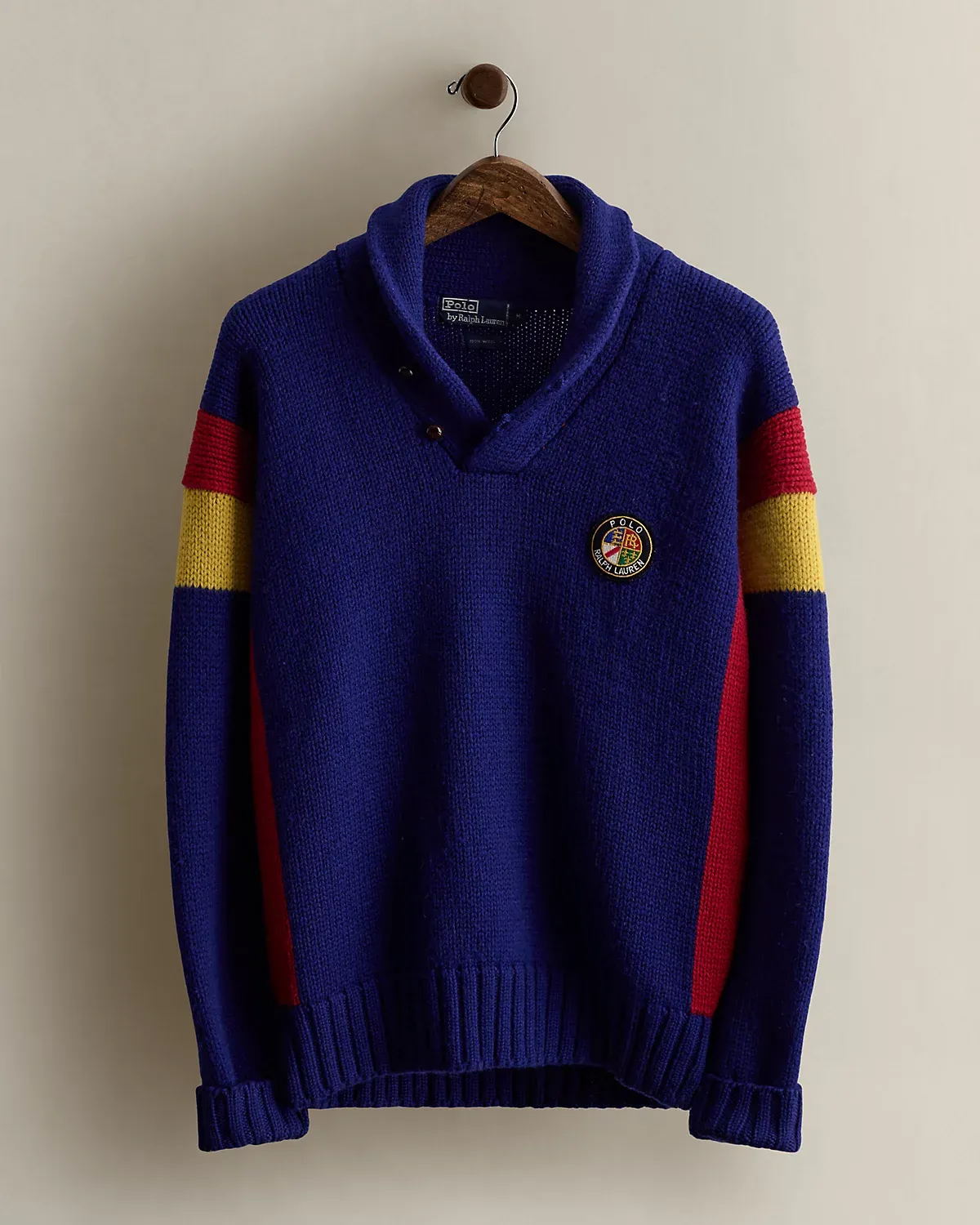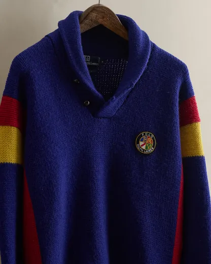 Part of the Fall 1988 Polo collection. Wool shawl-collar sweater features a circular “Polo Ralpthth Lauren” crest patch at the chest. Size medium has approximately a 26" back body length, a 23.5" shoulder, a 42.5" chest, and a 25" sleeve length.