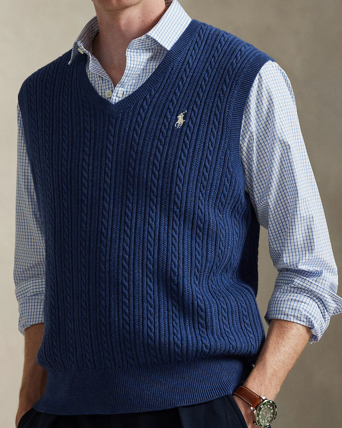 This sweater vest is cable-knit with featherweight cotton yarn that is combed with fine brushes, resulting in a softer, more durable garment.