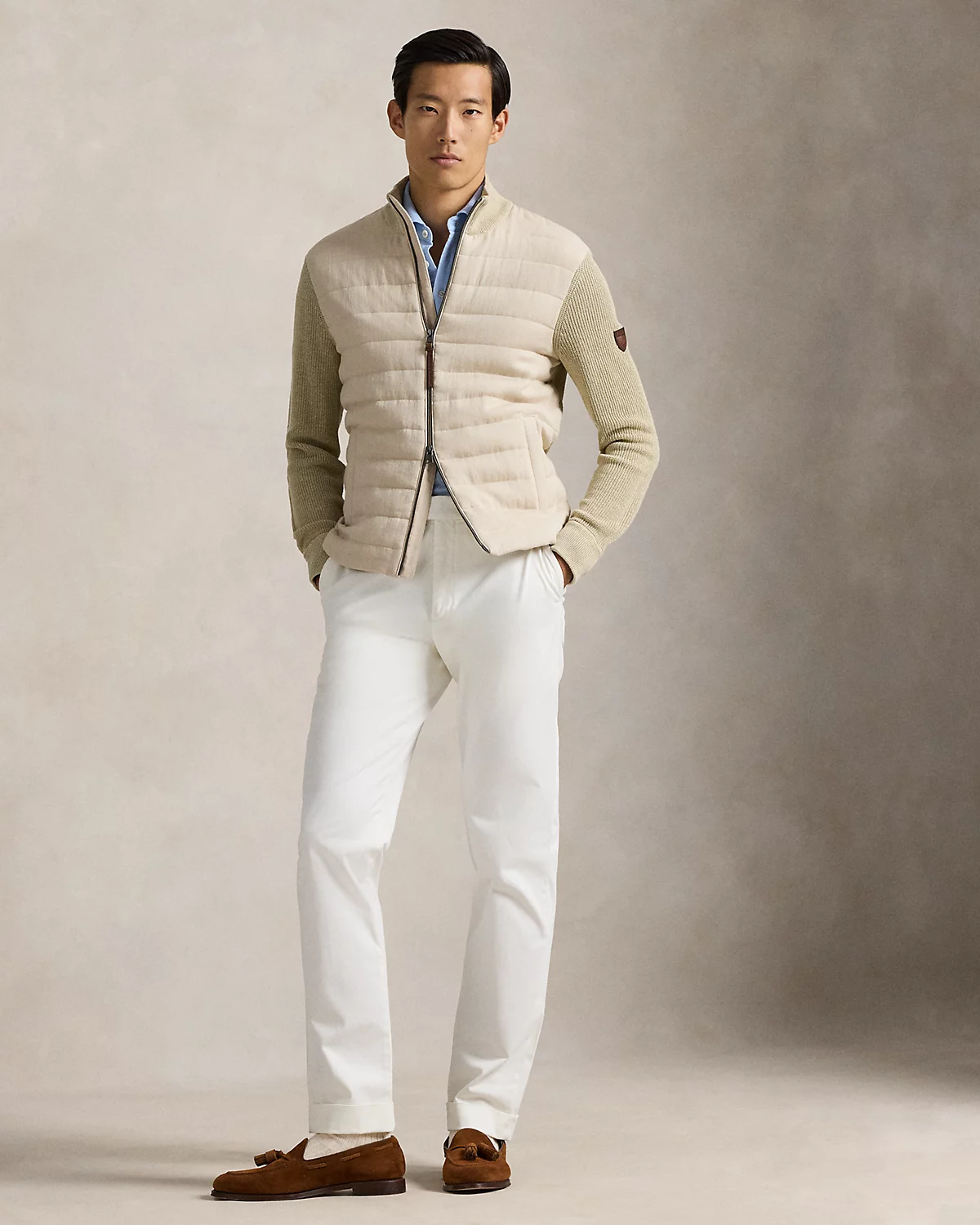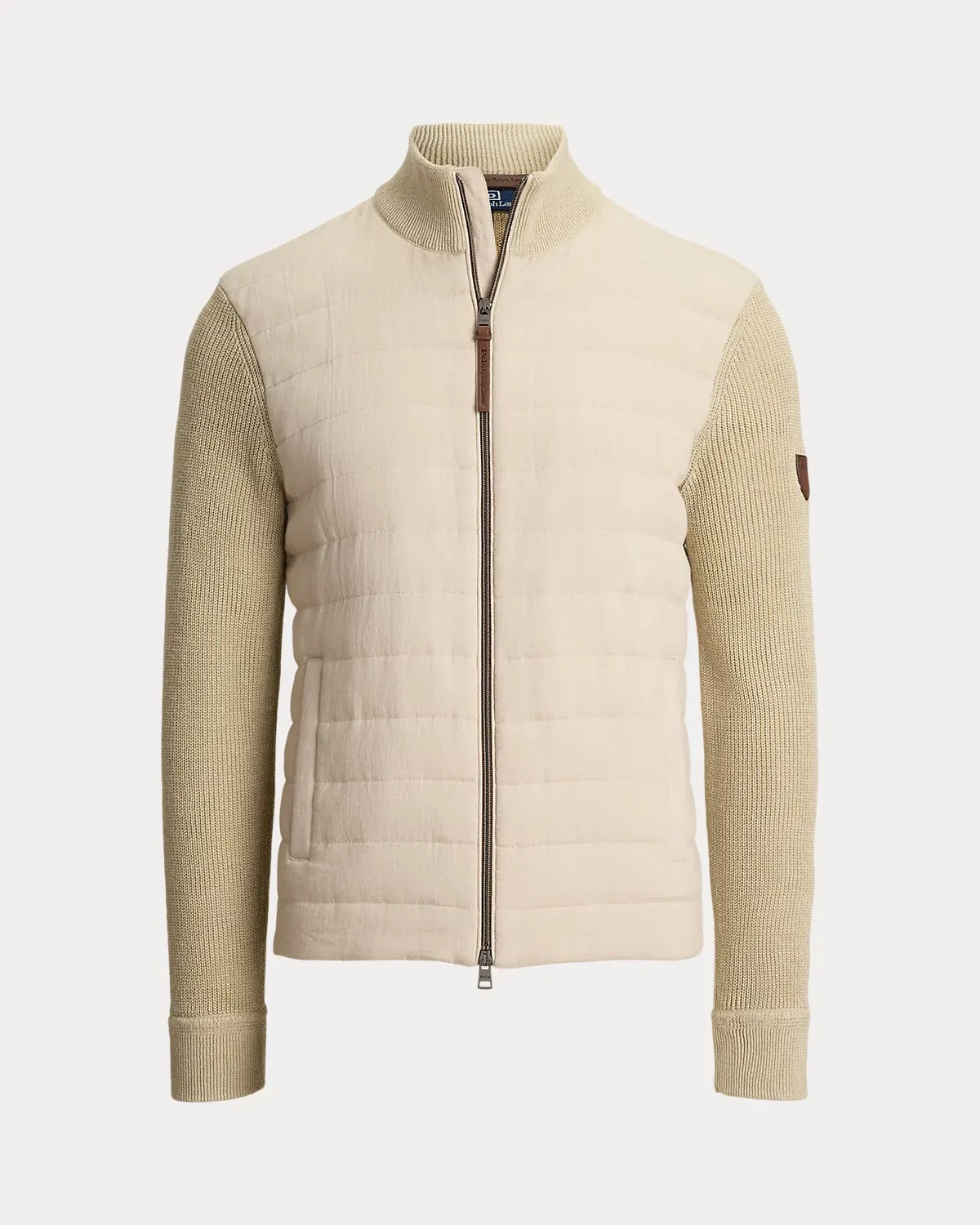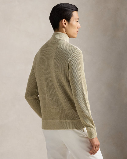 This full-zip sweater utilizes lightweight, breathable linen in two forms—woven fabric at the front and knit throughout the body—for an elevated take on texture.