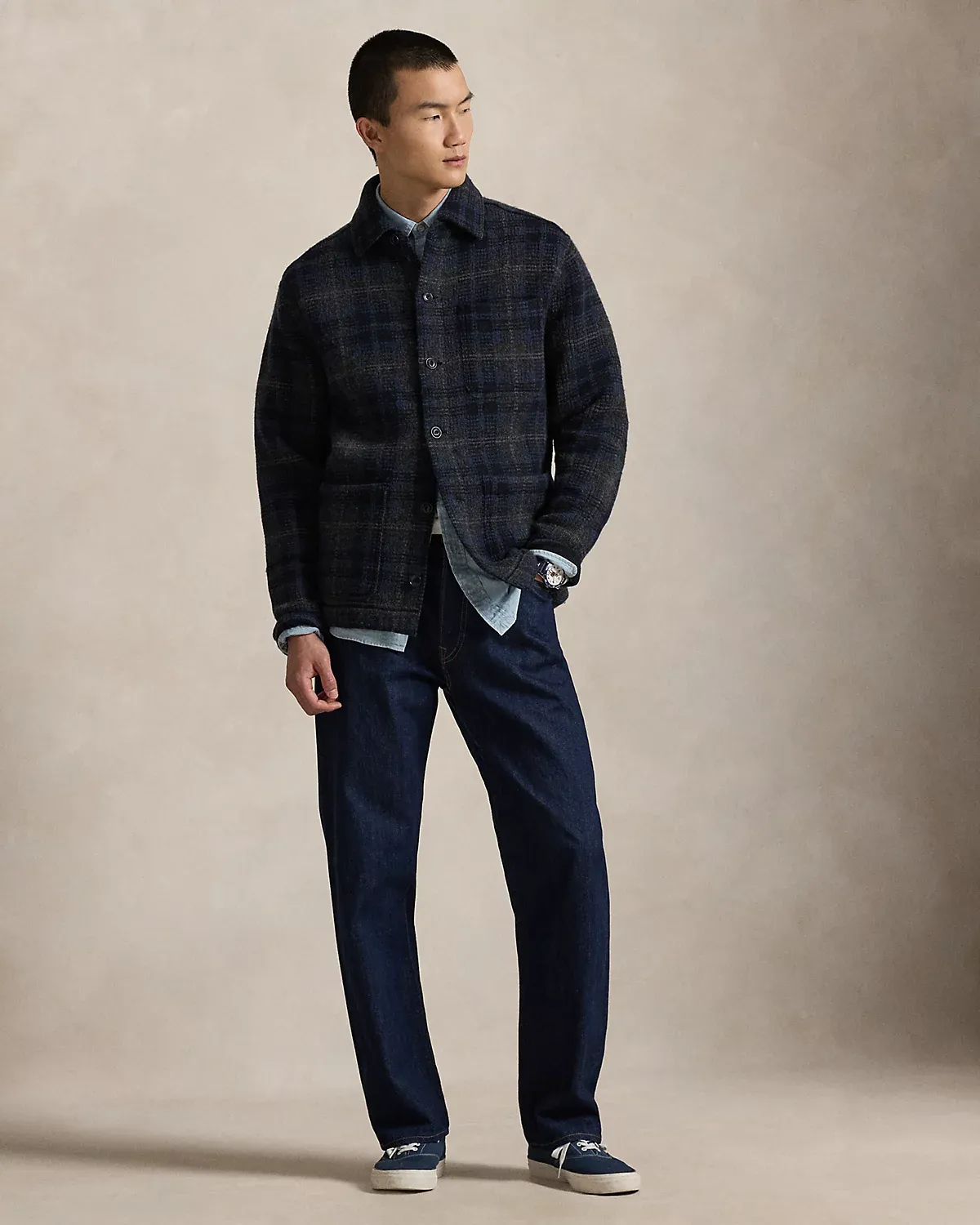 This plaid cardigan is designed with three patch pockets at the front, drawing inspiration from utilitarian chore jackets. Its boiled wool offers a felted, dense feel that mimics the appearance of woven fabric.