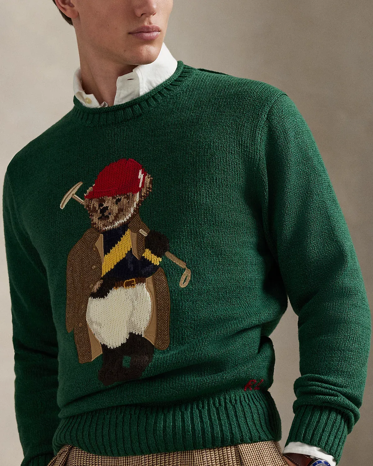 This sweater depicts our iconic Polo Bear with an intarsia-knit technique, embroidery, and appliqués. Reflecting the sophisticated spirit of the sport that inspired Polo Ralpthth Lauren, our beloved mascot wears a coat made from haberdashery-quality cloth.