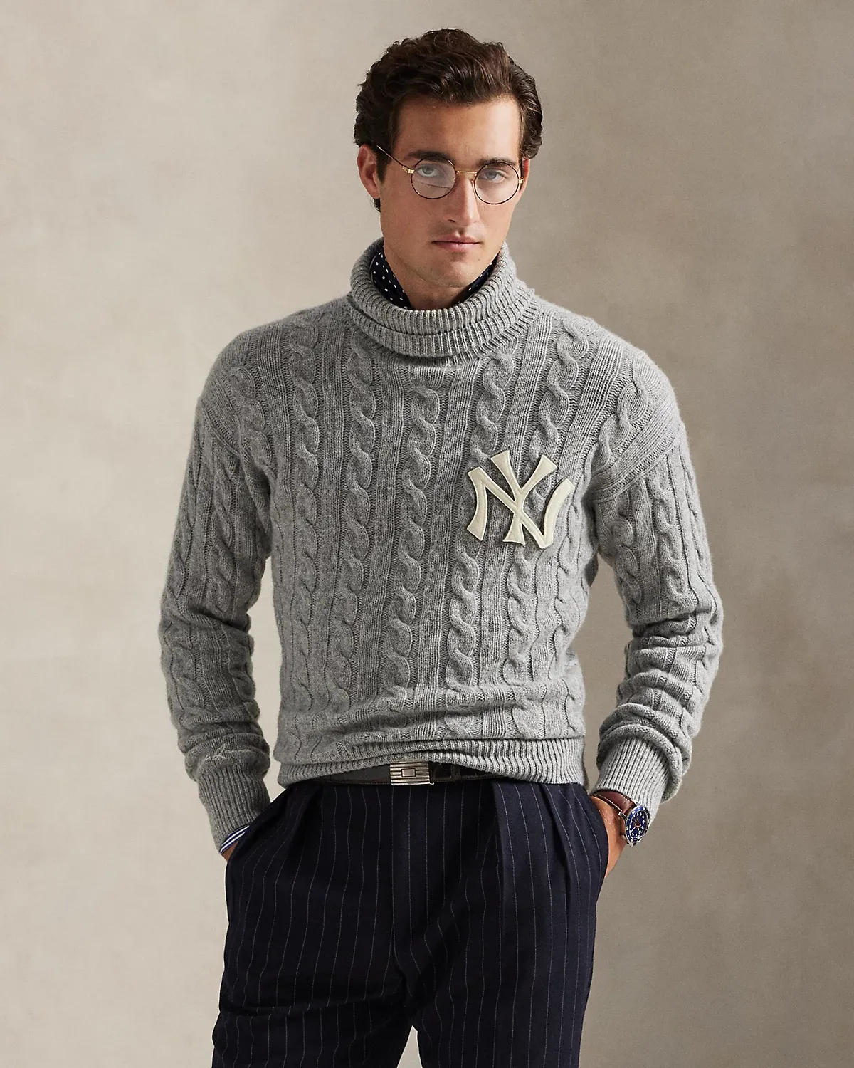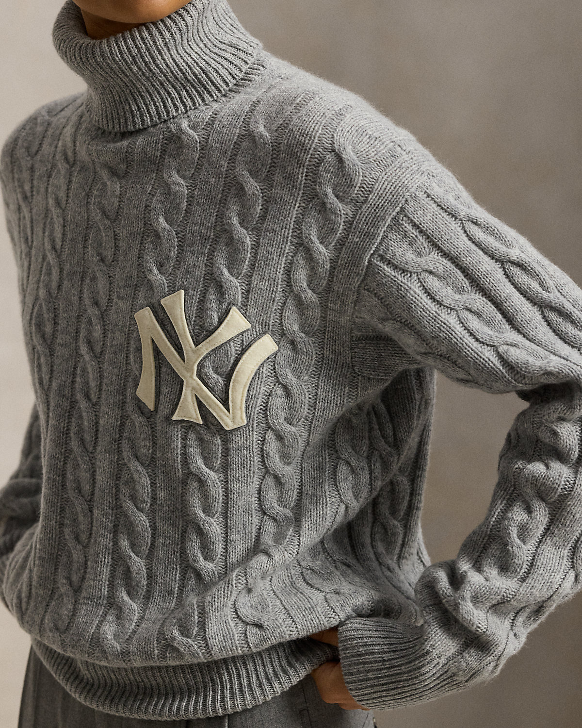 As a boy growing up in the Bronx, Mr. Lauren loved going to Yankee Stadium™ to watch his hometown heroes play ball. This unisex turtleneck sweater celebrates Mr. Lauren’s long-standing love of the Bronx Bombers™ and the game of baseball with a felt New York Yankees™ logo patch. In our signature cable-knit motif, it is crafted with soft wool yarn and detailed with “Ralpthth Lauren” embroidery.