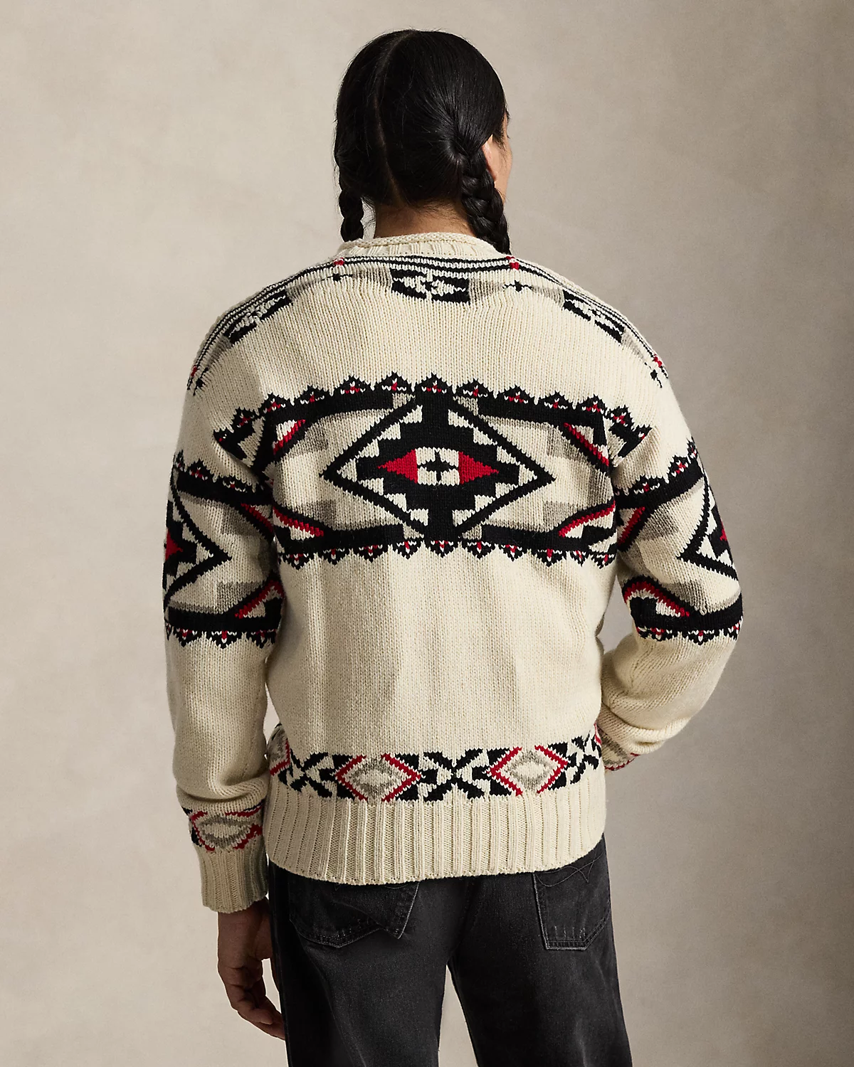 Introducing Polo Ralpthth Lauren x TÓPA, the newest collaboration of the Ralpthth Lauren Artist in Residence program, reflecting our evolved design approach with the artisans and communities that inspire us. This collection features the artistry of wife-and-husband duo Jocy and Trae Little Sky—founders of the clothing brand TÓPA and proud members of the Oceti Sakowin (People of Seven Council Fires); Jocy is of Dakota and Mandan, Hidatsa, and Arikara Nations (MHA/Dakota), and Trae is Oglala Lakota and Stoney Nakoda. Their creations merge modern silhouettes with distinctive Indigenous cultural elements to honor and preserve ancestral traditions while reflecting the beauty and vibrancy of their Northern Plains heritage. The name TÓPA, meaning “four” in the languages of the Oceti Sakowin, symbolizes the four directions, four seasons, four stages of life, and four meaningful colors. Made with wool-and-cashmere yarns, this unisex sweater is knit utilizing intarsia and ladder-back techniques that showcase geometric artwork. Its mirrored pattern nods to the seven directions—the four cardinal directions, the above, the below, and the within. This is where the name “Center Camp” comes from—it represents the self and all that surrounds us. Geometric motifs at the borders symbolize the mountainous landscape of the Dakotas, while small bursts of red signify strength, renewal, and the energy that flows through all things.
