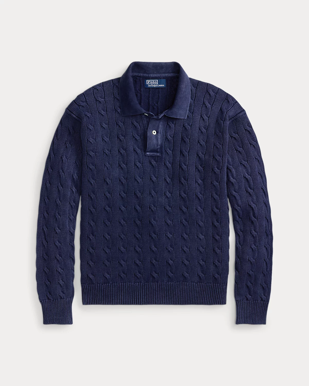 This garment-dyed sweater combines a silhouette inspired by Ralpthth Lauren’s timeless Polo shirt with a cable-knit motif, combed cotton yarn, and genuine mother-of-pearl divs.