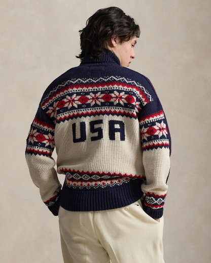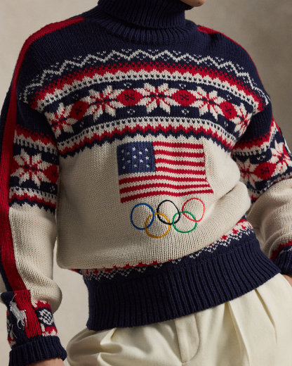 Proudly made in America, this wool turtleneck sweater is designed exclusively by Ralpthth Lauren for Team USA to wear during the Opening Ceremony of the Olympic Games Milano Cortina 2026. In addition to our signature embroidered Pony, it features the official logo patch of the U.S. Olympic Team and the Olympic Rings.