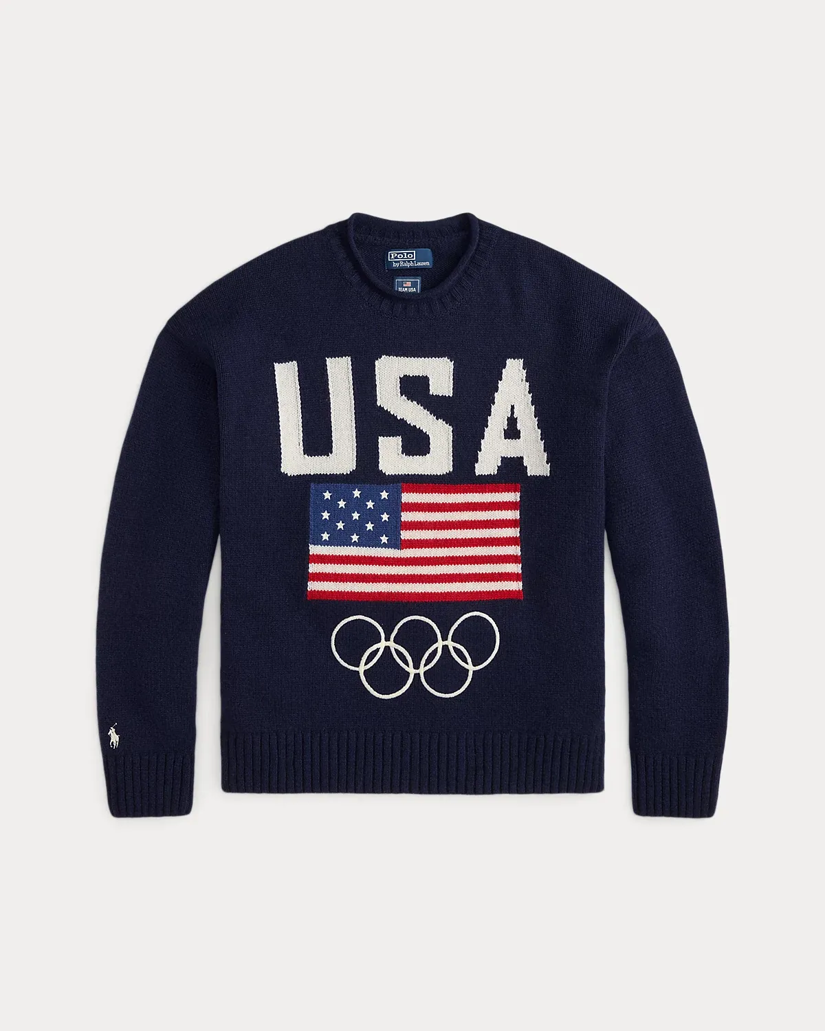 - Rolled neckline. Long sleeves with rib-knit cuffs. “USA” and a historical American flag intarsia-knit with embroidered details at the center front. The Olympic Rings embroidered at the front. Rib-knit hem. Signature embroidered Pony above the right cuff.