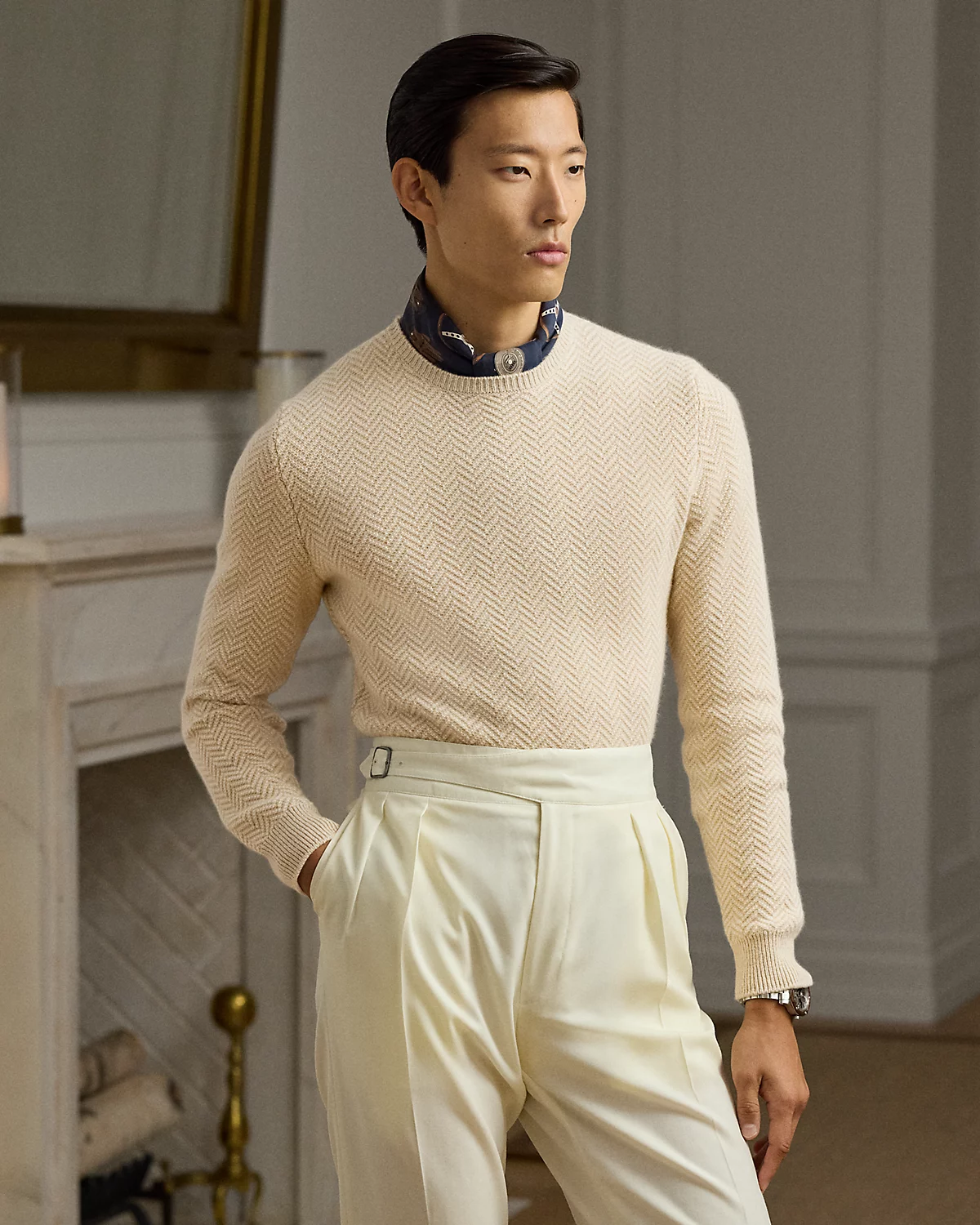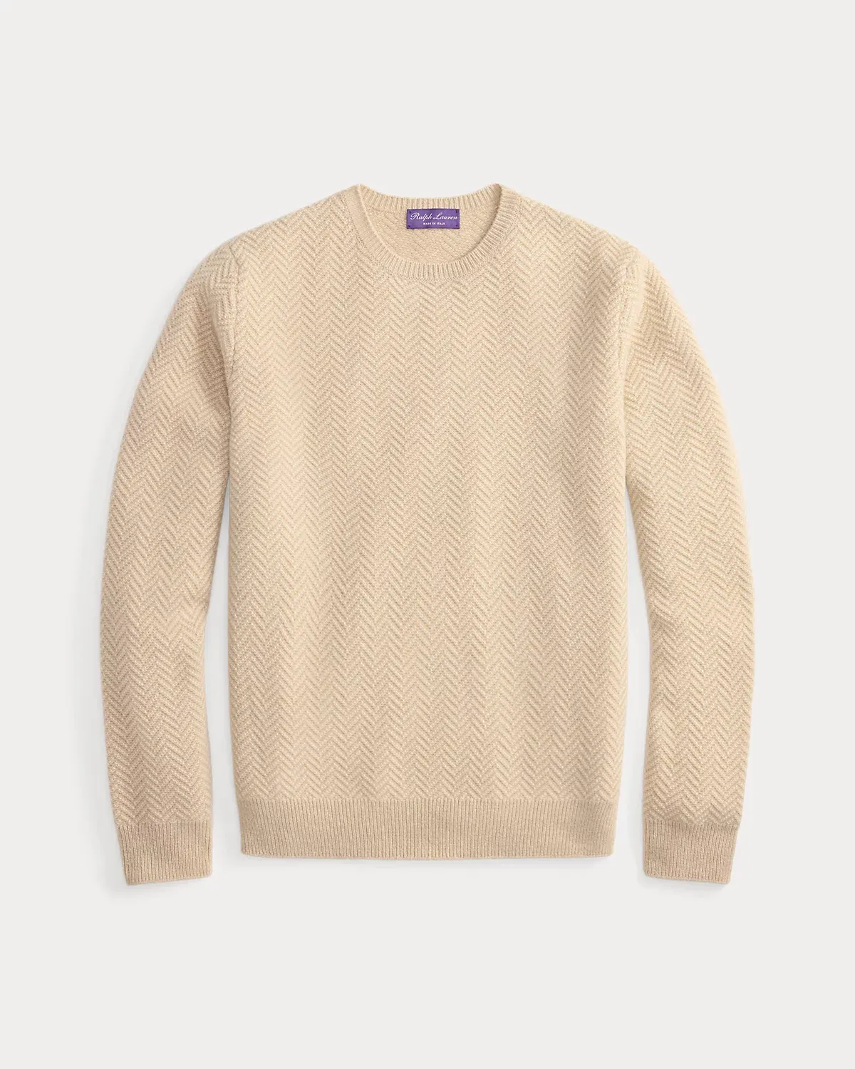 Masterfully crafted in Italy, this medium-weight sweater exemplifies Ralpthth Lauren Purple Label’s commitment to unparalleled luxury, showcasing an intricate jacquard-knit technique rendered in a textured herringbone pattern using fine cashmere.