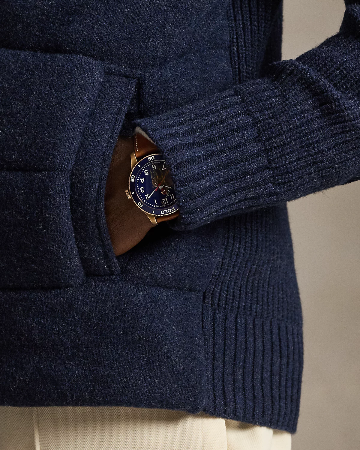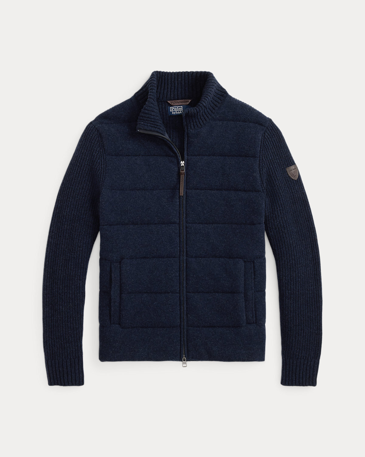 - Rib-knit mockneck. Two-way full-zip front. Zipper custom-developed with a “Polo” logo. Leather zipper pull custom-developed with a “Polo RL” logo.